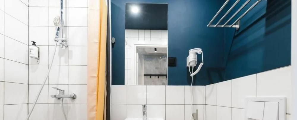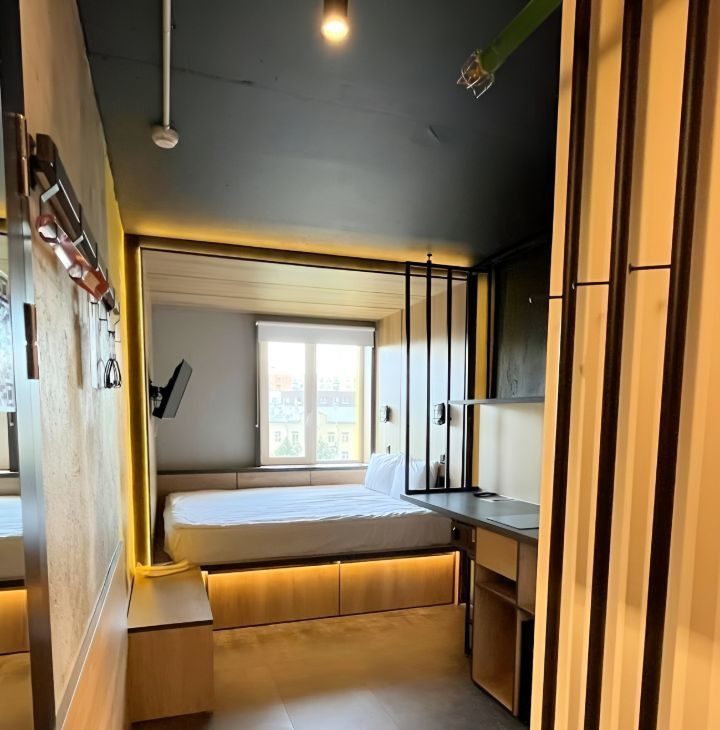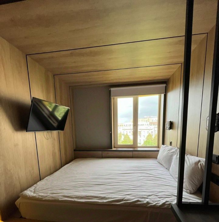 Уютная большая кровать с хитрыми ящиками для одежды, стильная кухня, холодильник, ТВ напротив и супер-удобный душ — всё на месте для вашего комфорта!