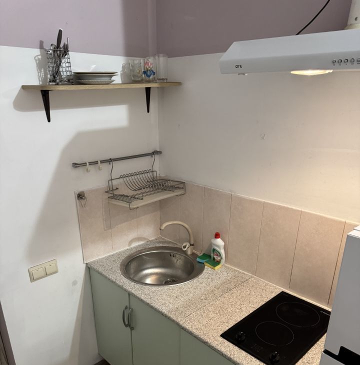 Сама студия 22 метра, кухонная зона, санузел с душевой кабиной. Стиральная машина общая в коридоре на 4 комнаты. Есть места хранения, кровать 160х200. Соседи тихие, работающие. Показываю по договоренности в удобное для вас время.