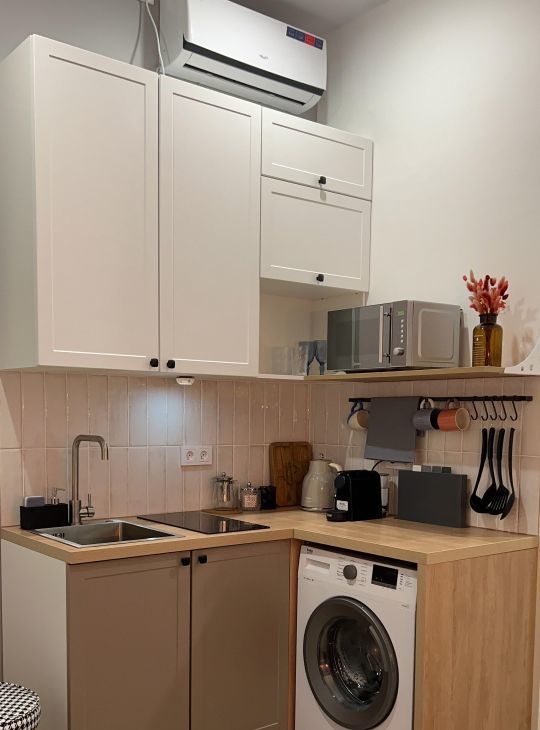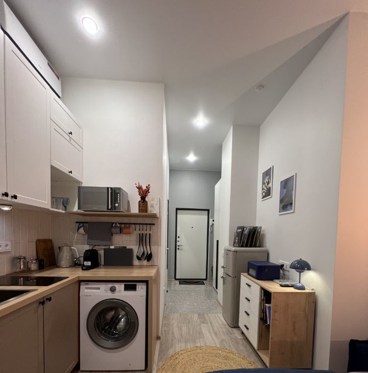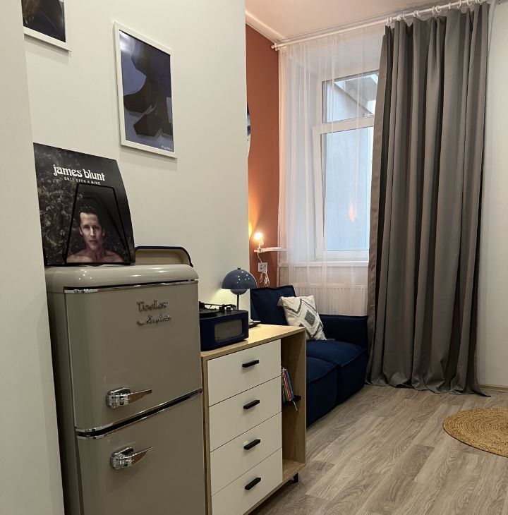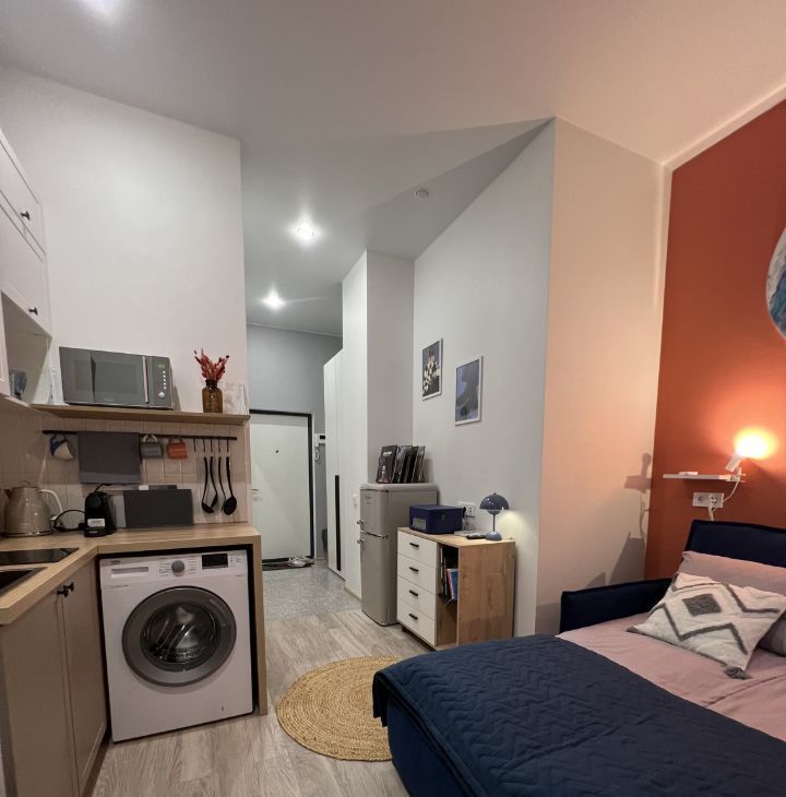 В квартире есть все необходимое для проживания. Телевизор со смарт ТВ, холодильник,стиральная машина, микроволновка, виниловый проигрыватель.