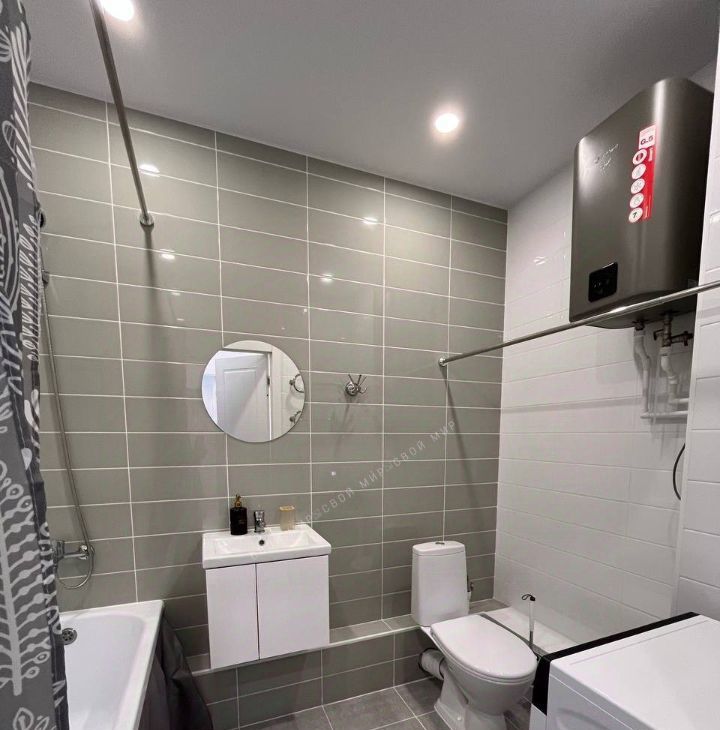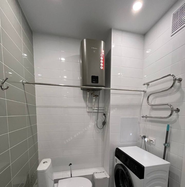 В ванной комнате: стиральная машинка, бойлер для нагревания воды.