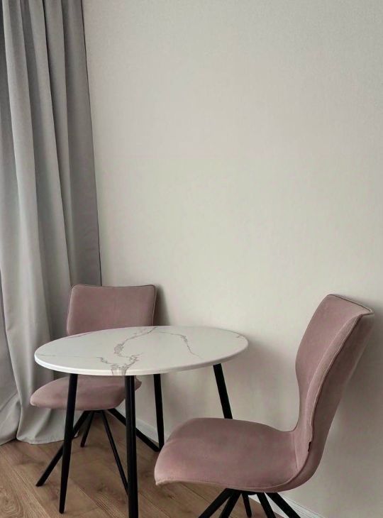 Студия наполнена новой комфортной мебелью: современный кухонный гарнитур, удобная двуспальная кровать с матрасом, большой шкаф для одежды, дизайнерские стулья, обеденный стол.