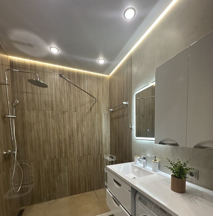 Совмещенный санузел выполнен в современном стиле с душевой кабиной и стиральной машиной.