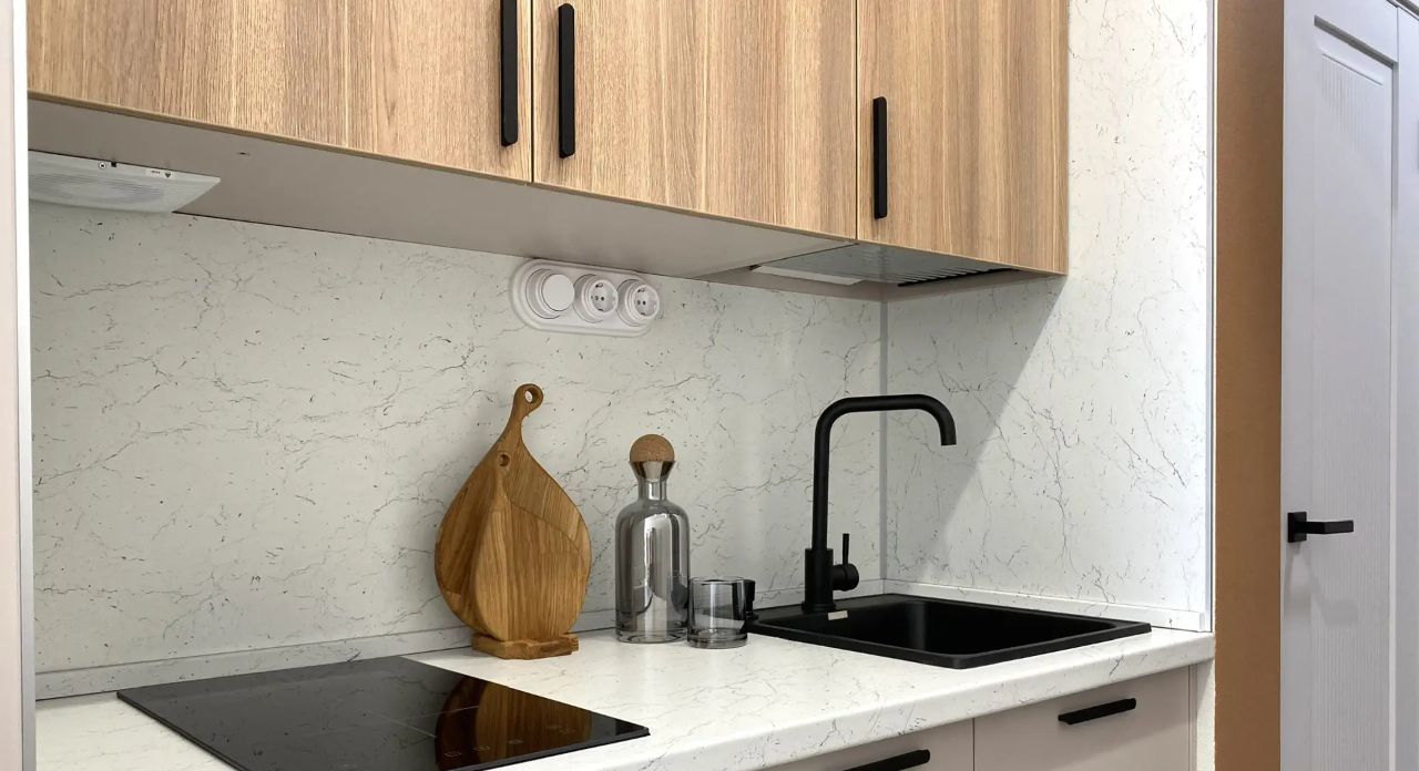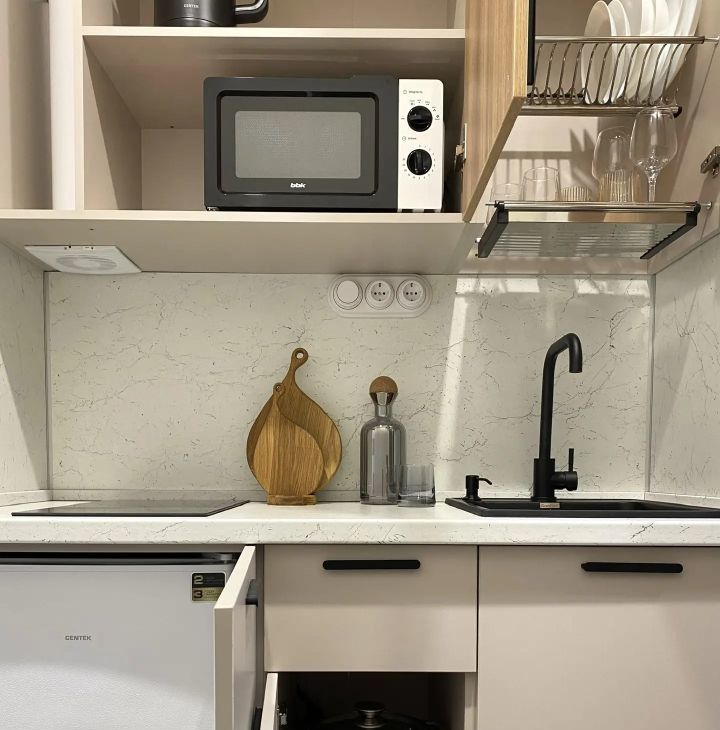 - Кухонный гарнитур (микроволновая печь, индукционная варочная плита на 2