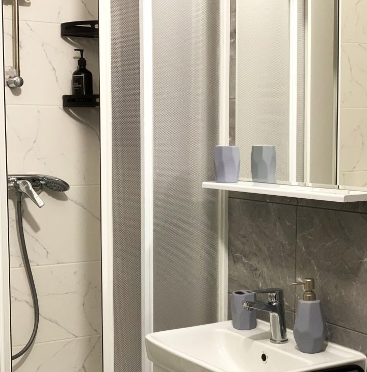 В ванной комнате с подогреваемым полом, есть стиральная машина, фен, этажерка для косметических средств. Также в вашем распоряжении утюг с гладильной доской, сушилка для одежды.