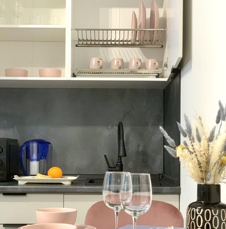 Кухня, оборудована холодильником, варочной панелью, СВЧ печью, эл. чайником, стильной посудой, бокалами для напитков, посудой для приготовления пищи.