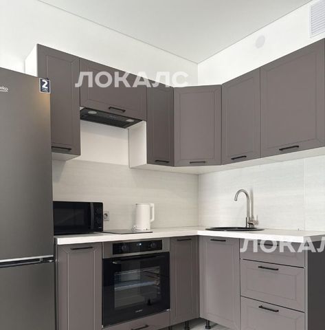 В зоне кухни - встроенная индукционная варочная панель, холодильник, духовка и микроволновая печь.