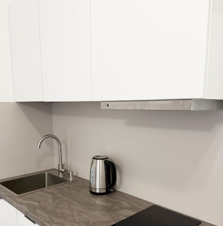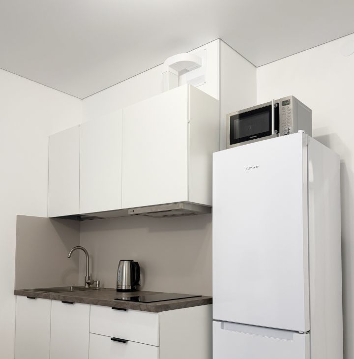 В квартире стильный кухонный гарнитур, индукционная варочная панель, встраиваемая вытяжка, микроволновая печь, электрочайник и большой двухкамерный холодильник. В зоне кухни расположен большой обеденный стол и два стула.