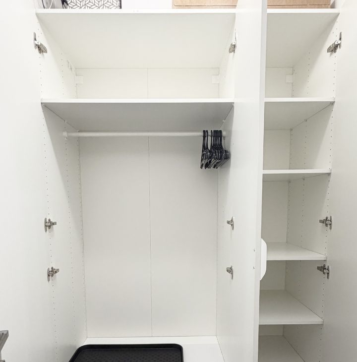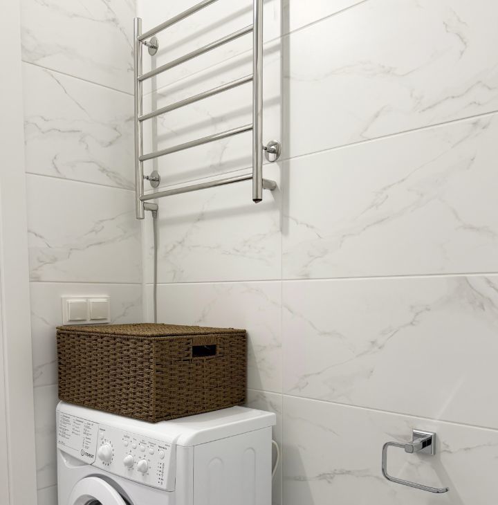 Санузел совмещенный, душевая кабина, стиральная машина, электрический полотенцесушитель, удобная напольная сушилка для белья и корзина для белья.