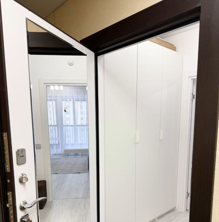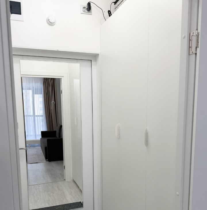 В спальной зоне удобный двуспальный диван, стильный и вместительный комод, журнальный столик, телевизор. В коридоре расположен большой и вместительный шкаф для вещей, зеркало во весь рост.