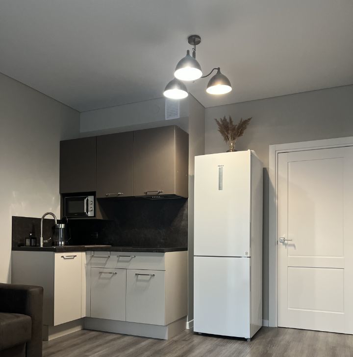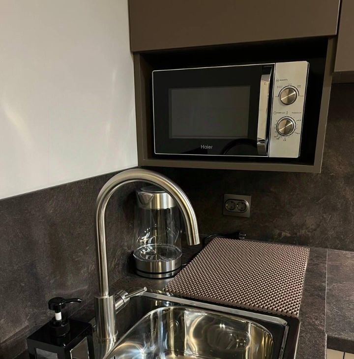Студия оснащена всей необходимой мебелью и бытовой техникой.