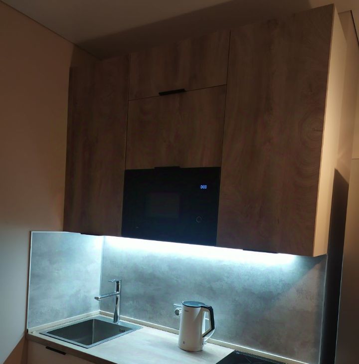 Современная мебель и техника (индукционная плита, вытяжка, встроенная микроволновка, полноценный большой холодильник с системой no frost) — можно заехать и жить сразу