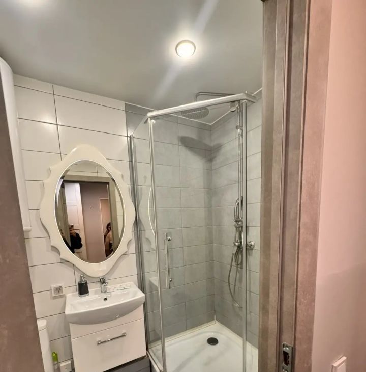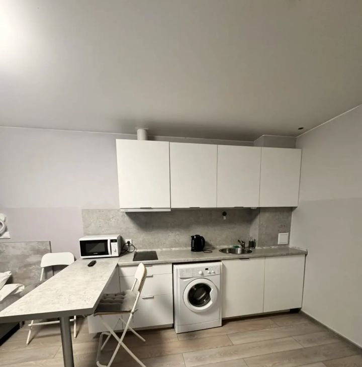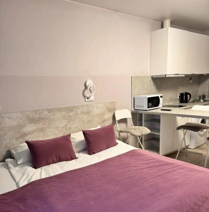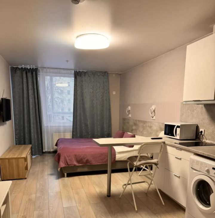 В студии выполнен дизайнерский ремонт. Пространство оформлено современно и со вкусом. Есть вся необходимая мебель как на кухне, так и в комнате. Из техники — холодильник, телевизор и стиральная машина. Санузел совмещенный, оборудован душевой кабиной. Окна выходят во двор, что обеспечивает тишину и спокойствие.