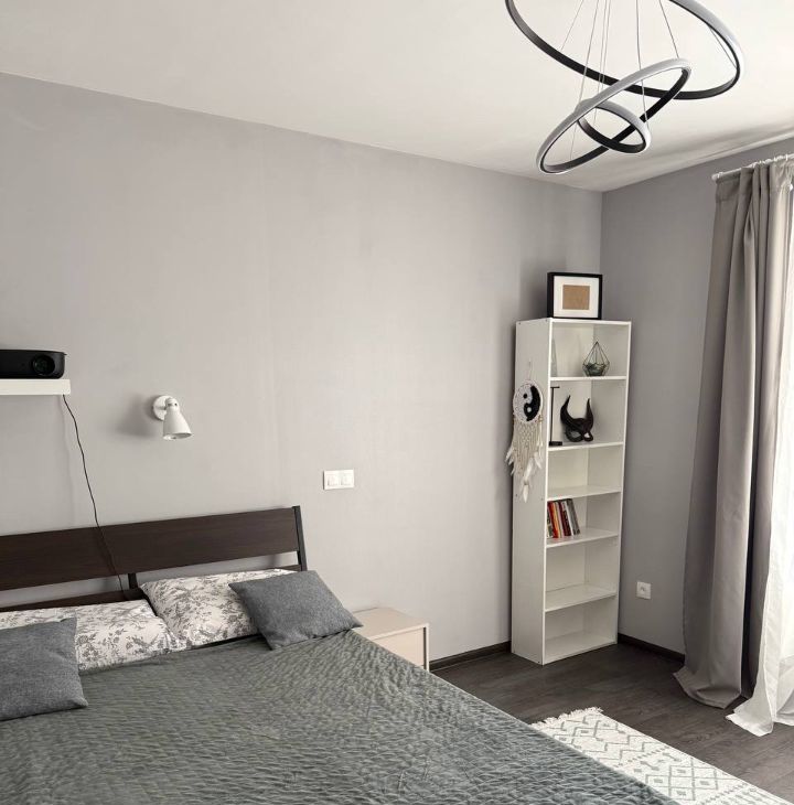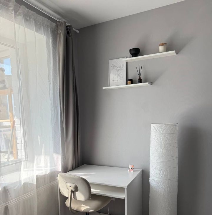 В комнате есть рабочая зона, кровать 140*220 с ортопедическим матрасом, декоративный свет, проектор, чтобы вы наслаждались вечерними просмотрами фильмов. Одеяло, ортопедические подушки, постельное белье и полотенца — заезжай и живи. Для хранения предусмотрел большой шкаф из Икеи.