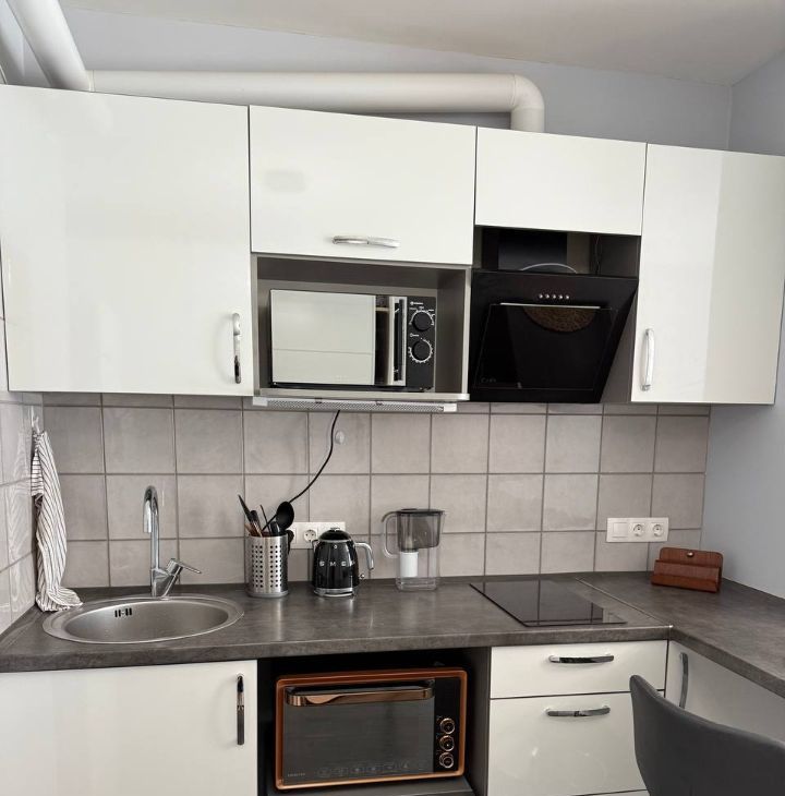 В квартире есть все необходимые удобства: холодильник Bosch, варочная панель, микроволновка, чайник SMEG, посудомойка, маленький духовой шкаф для приготовления чудесных пирогов. Вся необходимая посуда и приборы имеются.