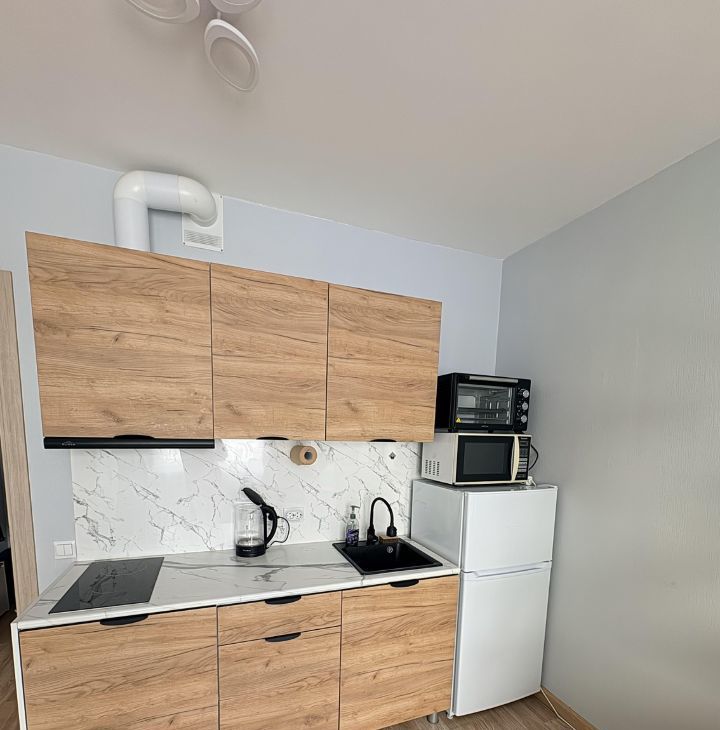 Квартира-студия общей площадью 20,5 кв.м. на 7 этаже 17 этажного дома со свежим ремонтом, мебелью и техникой. Для комфортного проживания есть все необходимое. Из мебели: места для хранения вещей в комнате, кухонный гарнитур, раскладной диван, обеденный стол, стулья. Из техники: стиральная машина, холодильник, СВЧ-печь, мини-печь электрическая, варочная панель, чайник
