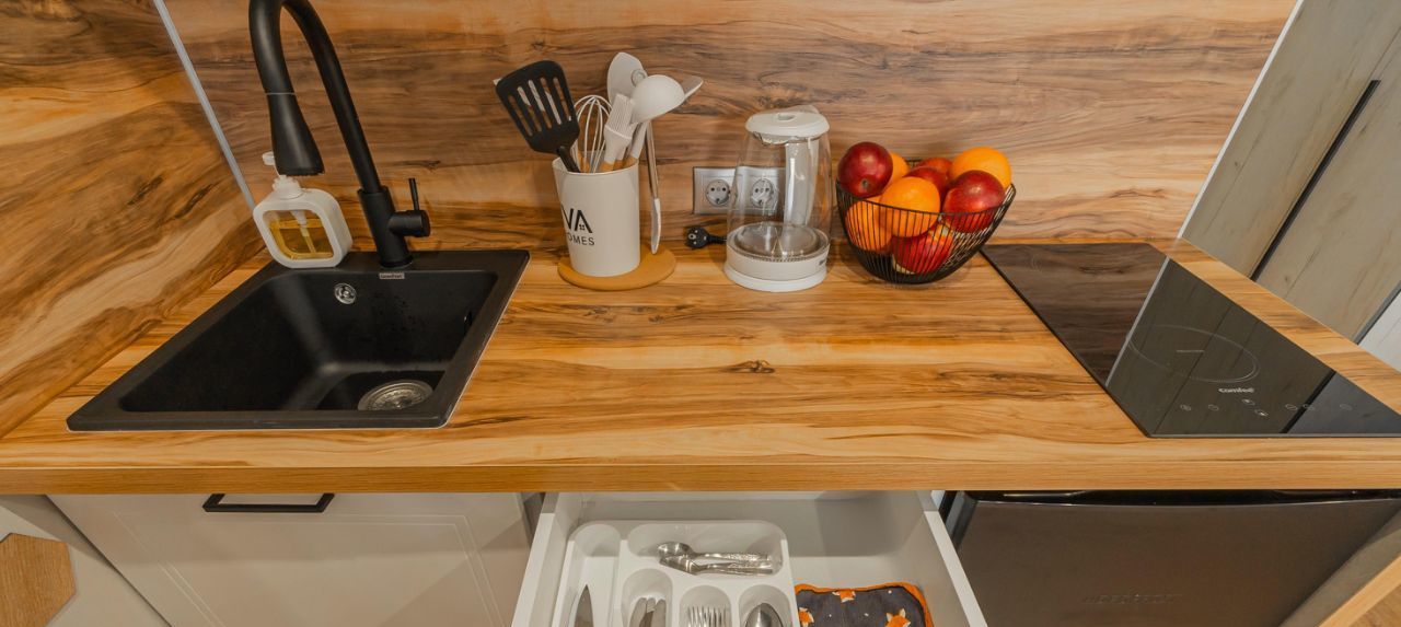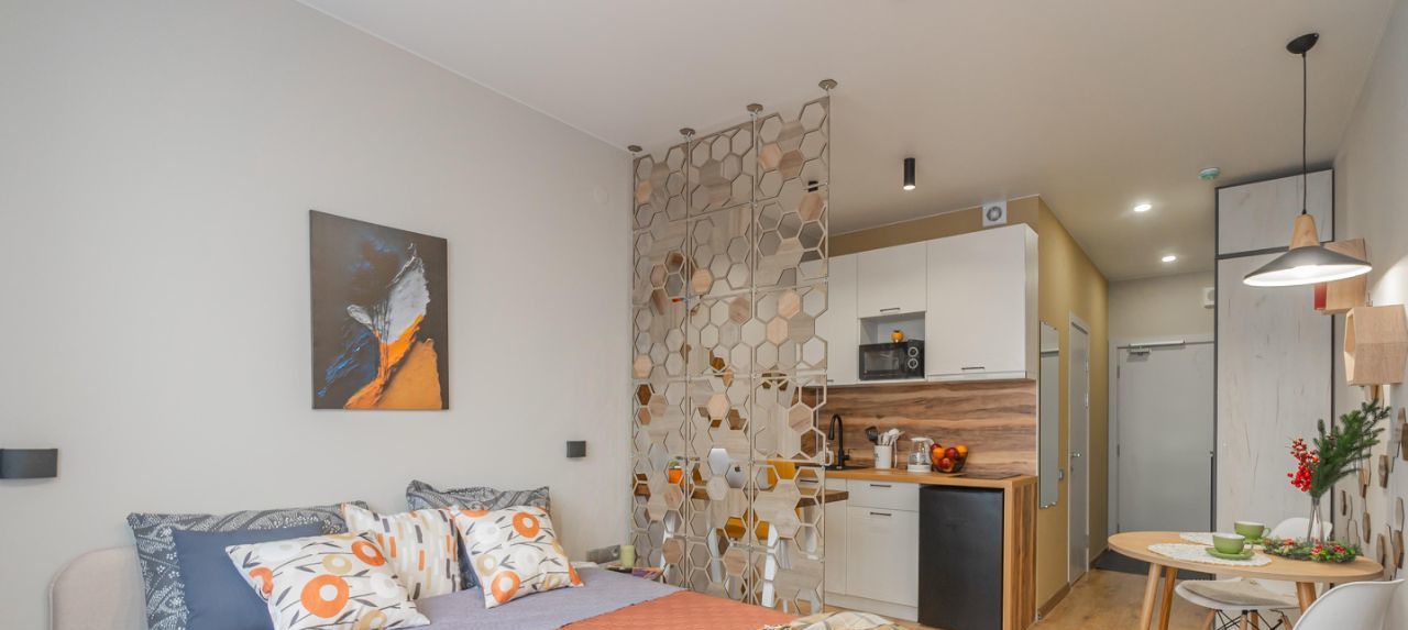 Спальня совмещена с кухонной и обеденной зоной.