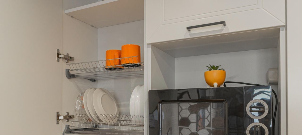 - обеденная зона (холодильник, чайник, микроволновка, плита, столовая группа, посуда на 2 персоны, стол со стульями)
