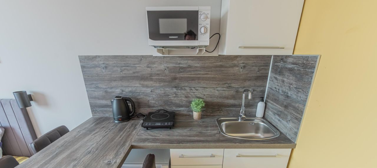- обеденная зона (холодильник, чайник, микроволновка, плита, столовая группа, посуда на 2 персоны, стол со стульями)