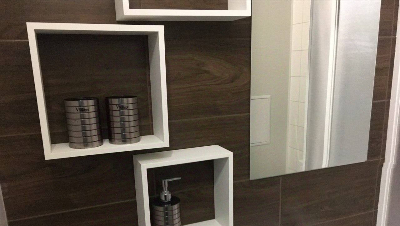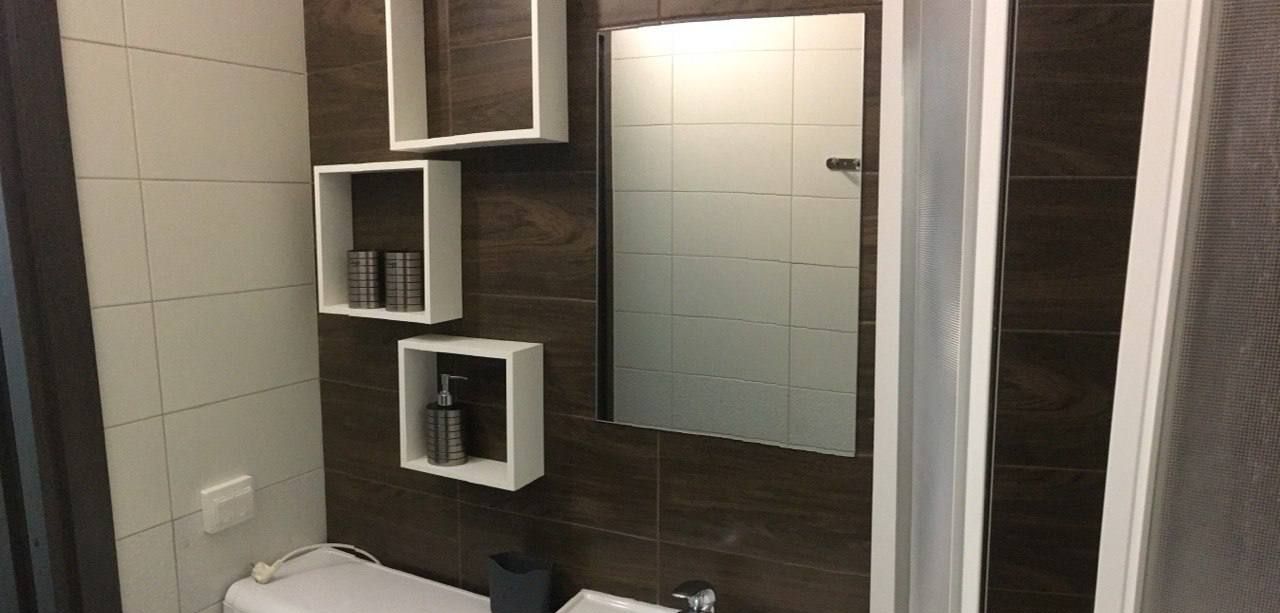 Санузел: душевая кабина, умывальник, унитаз, тёплый пол, стиральная машина, полки для хранения, зеркало.