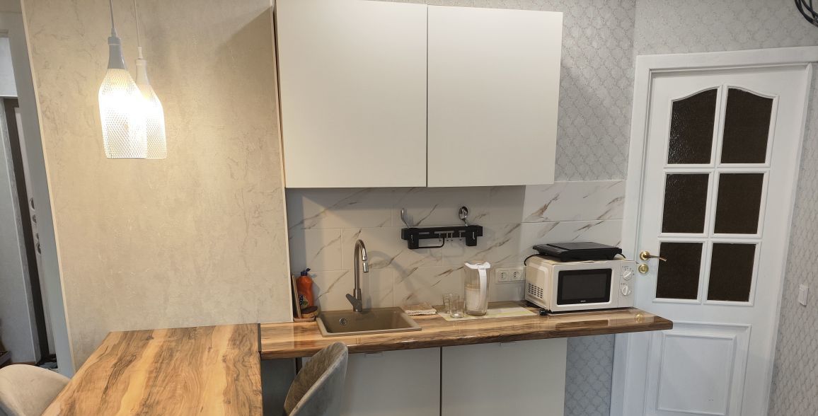 Кухонная зона полностью укомплектована всем необходимым — электрическим чайником, микроволновкой, холодильником и посудой для готовки. Барная стойка и стулья созданы для того, чтобы вы смогли наслаждаться домашними ужинами в компании.