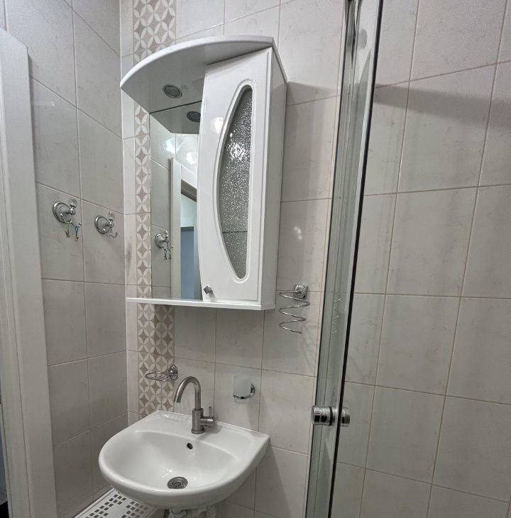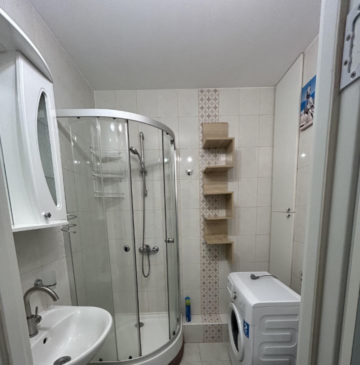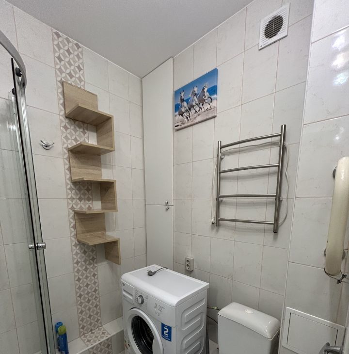 Квартира: кухня с плитой и микроволновой печью, холодильник, стол, стулья, кровать металлическая (ширина 120см), шкаф, душевая кабина, стиральная машина, интернет и тв подведены, есть остеклённый балкон.