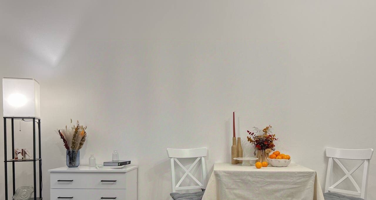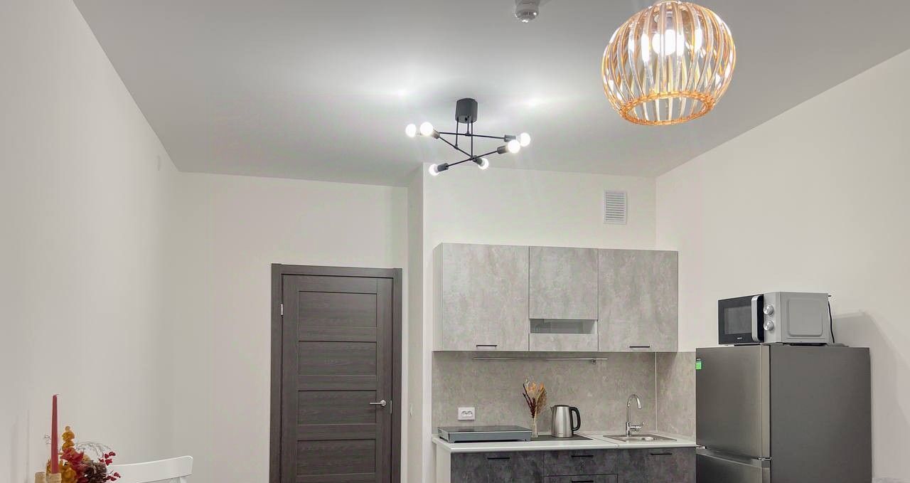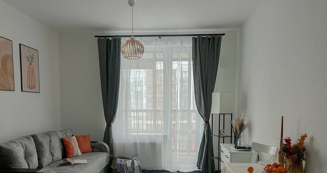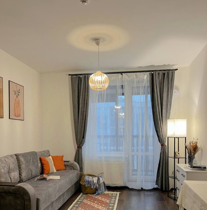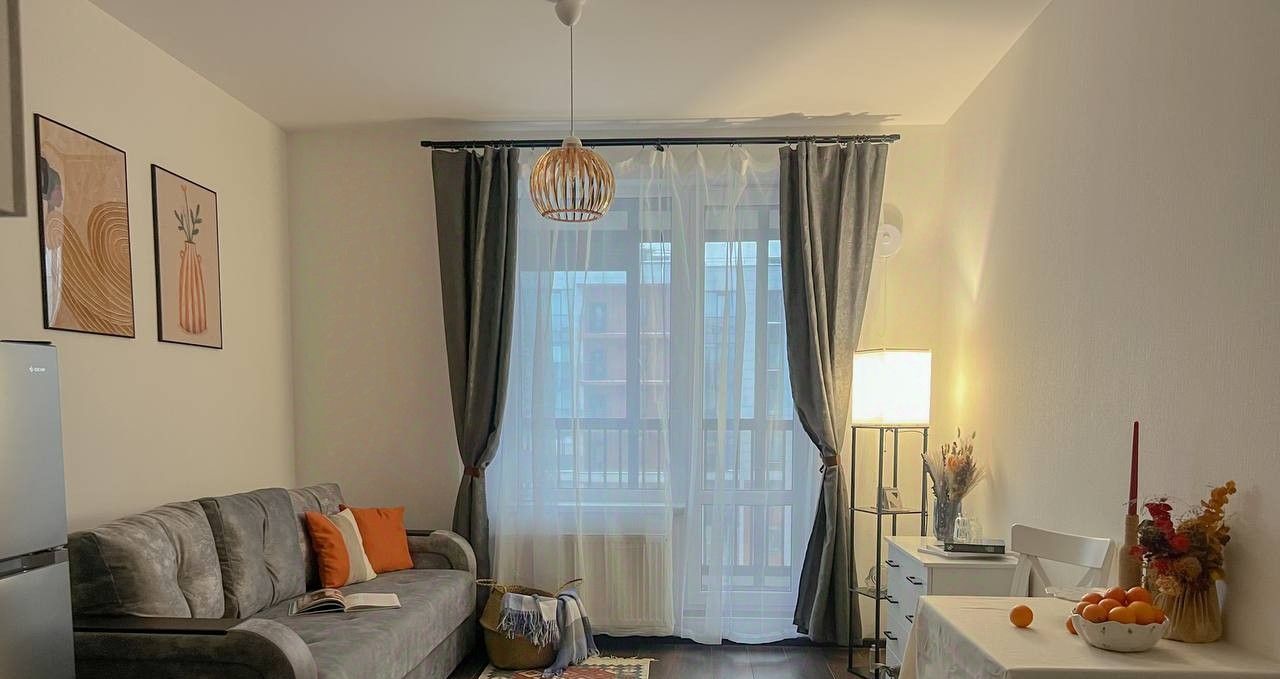 Удобный раскладной диван, продуманное освещение (подвесной светильник и дополнительный торшер с возможностью регулирования цветовой температуры), компактная обеденная зона на 2 персоны — идеальное пространство как для отдыха, так и для работы из дома.