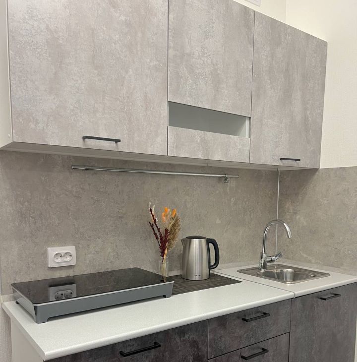 Кухонный гарнитур в актуальном дизайне, мобильная варочная панель, позволит освободить рабочую поверхность кухни, когда это необходимо, холодильник, микроволновая печь, электрический чайник — всё в отличном состоянии. Места для хранения достаточно, кухня укомплектована необходимой посудой и столовыми приборами!