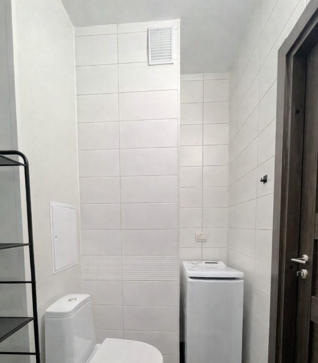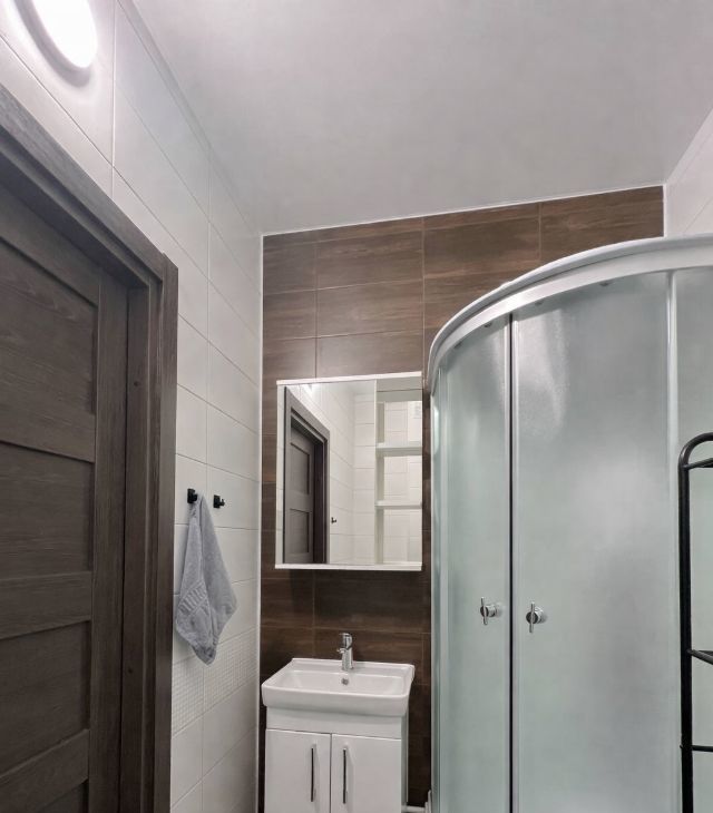 Установлена новая душевая кабина — практично и удобно. В качестве системы хранения предусмотрена закрытая полка с зеркалом над раковиной, а также лаконичный стеллаж.