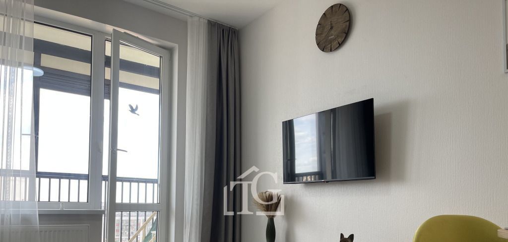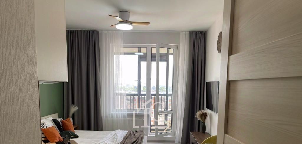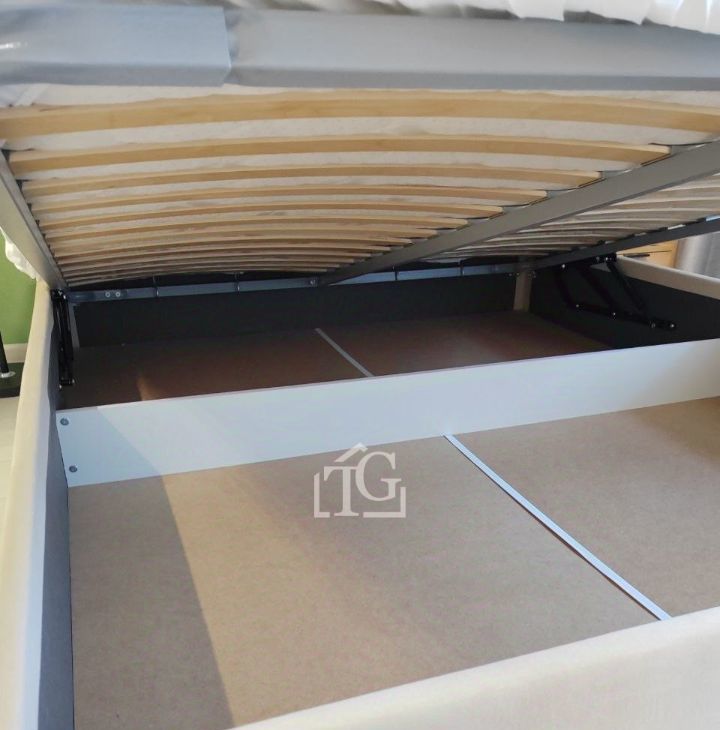Кровать с подъёмным механизмом (для хранения сезонных вещей), двусторонний матрас (разной жёсткости), размер 160*200, мягкое изголовье. Над кроватью люстра с вентилятором с возможностью изменения яркости и теплоты освещения. Телевизор 43 диагональ с Яндекс ТВ (голосовое управление Алиса).