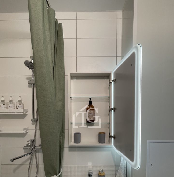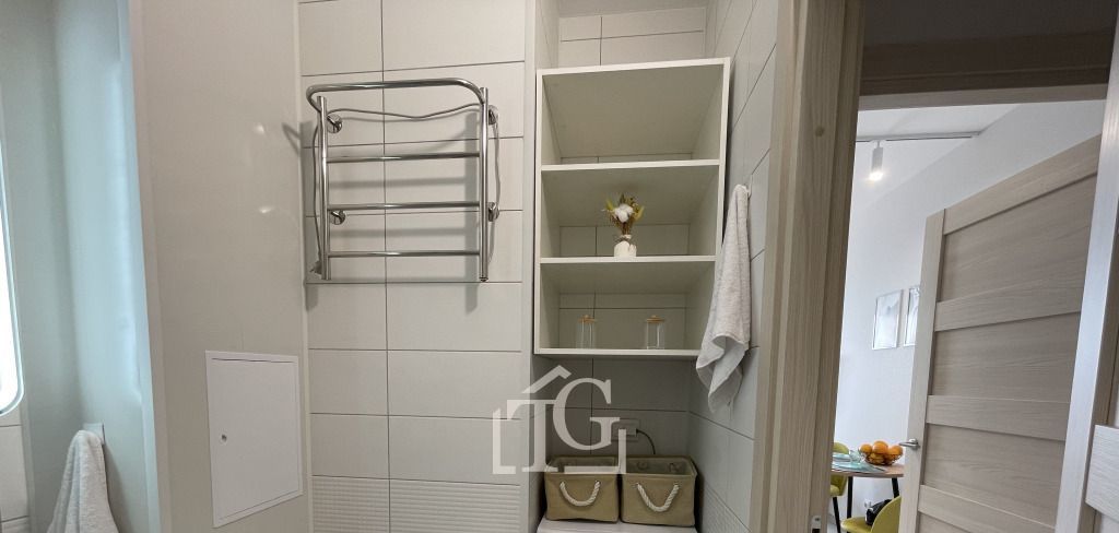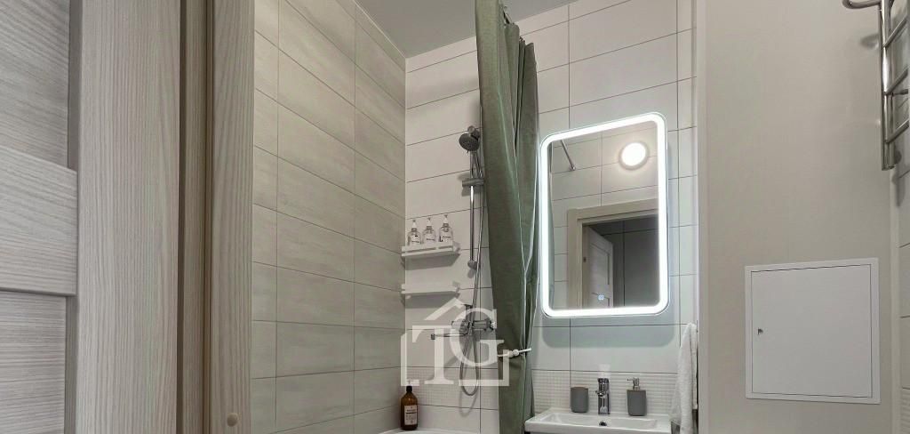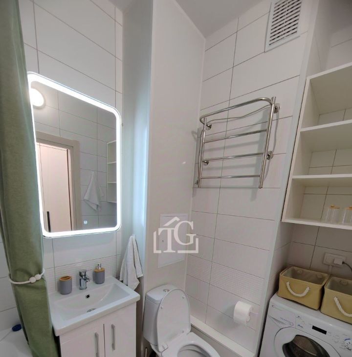 В ванной комнате стиральная машина горизонтальной загрузки, шкафчик с подсветкой и дополнительный стеллаж для хранения, электрический полотенцесушитель. Подогрев пола.