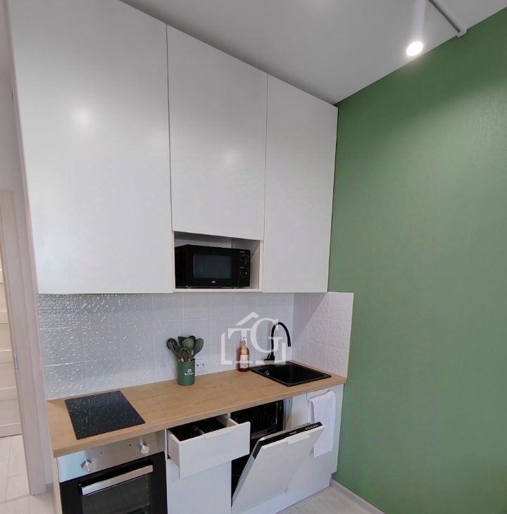 Кухня под потолок - большой объём хранения. Варочная панель, духовой шкаф, вытяжка, посудомоечная машина, СВЧ, электрический чайник. Двухкамерный холодильник. Трековое освещение.