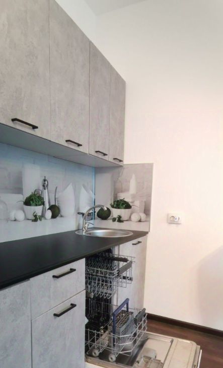 Кухня: современный гарнитур, посудомоечная машина (забудьте о горах посуды!), холодильник, СВЧ и чайник.