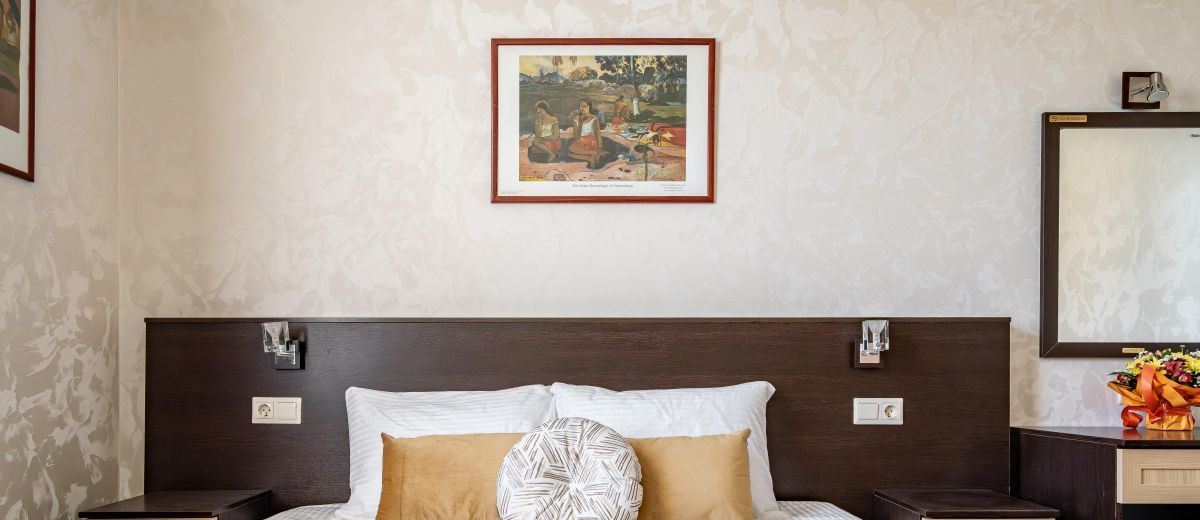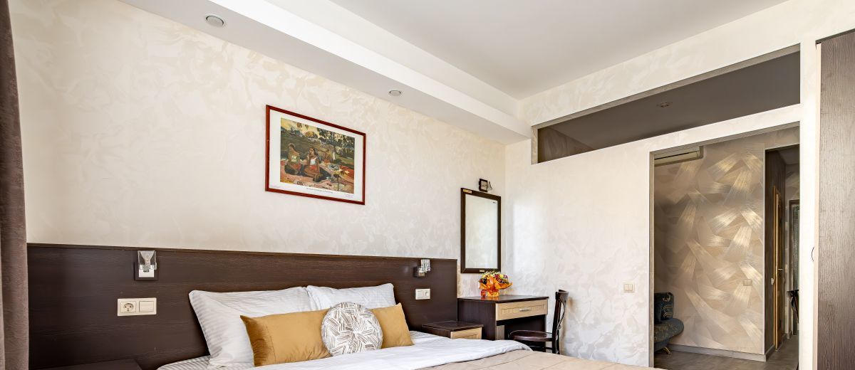 Мебель: двуспальная кровать 180 см, кресло, стол, стулья, два платяных шкафа.