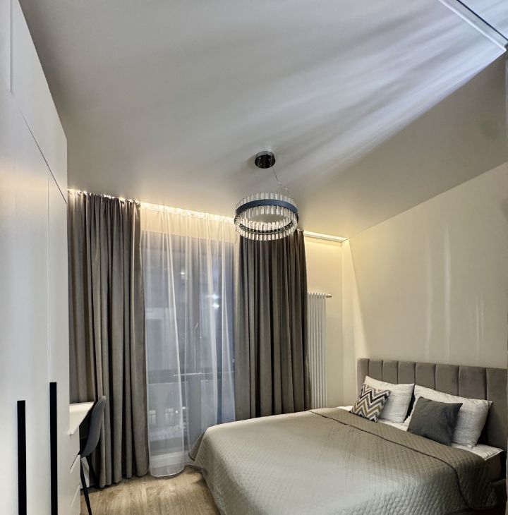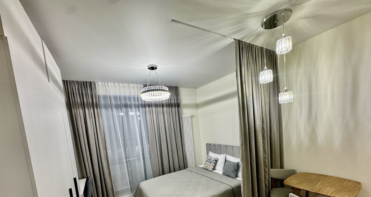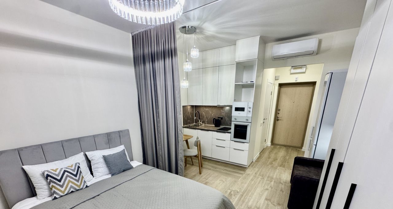 Зона спальни отделена от кухни шторками, что позволяет комфортно разместиться в квартире двоем. Кровать 160*200 с подьемным механизмом-дополнительное места хранения.