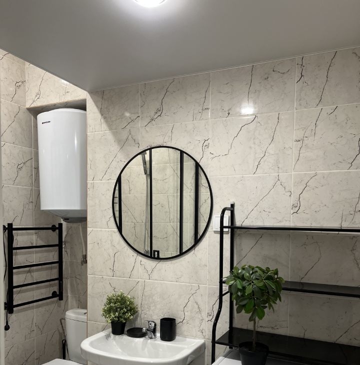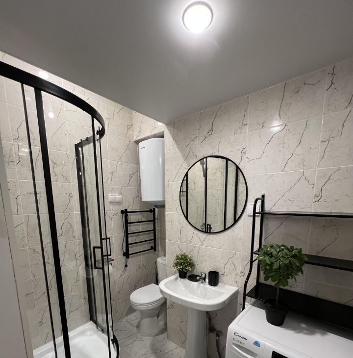 Ванная комната с душевой кабиной, большим бойлером, стиральной машинкой с функцией сушки, полотенцесушителем, стеллажом для хранения.