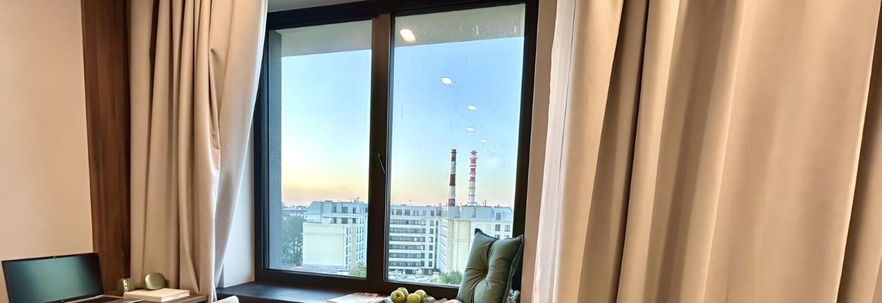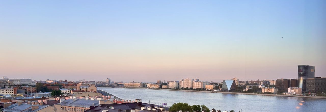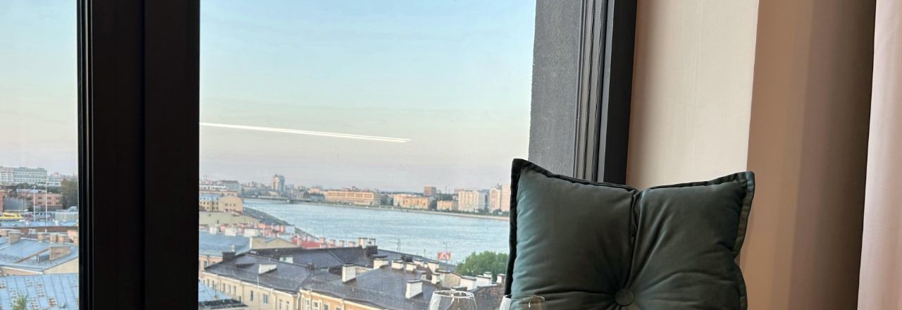 Хорошая шумоизоляция, вид замечательный: из окна видна Нева, Большеохтинский мост и Смольный собор
