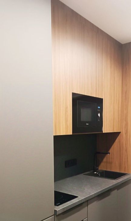 В апартаментах зона кухни выделена, хорошая шумоизоляция, кровать с ортопедическим матрасом.