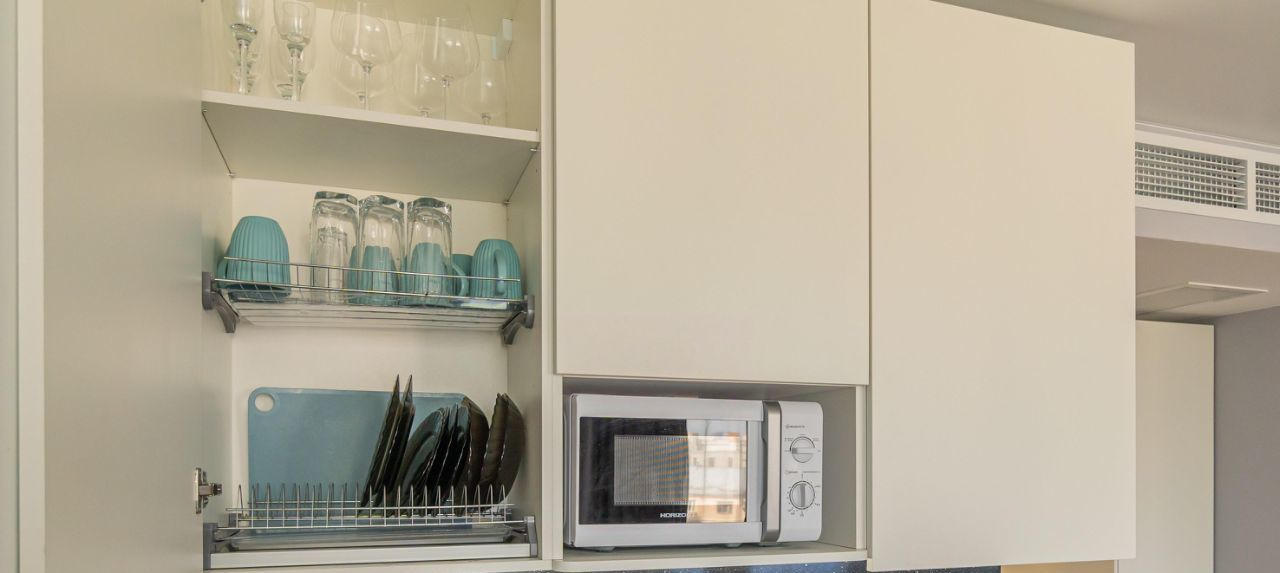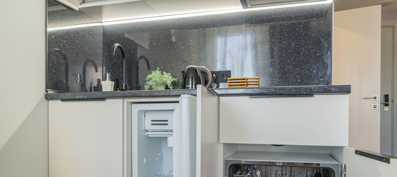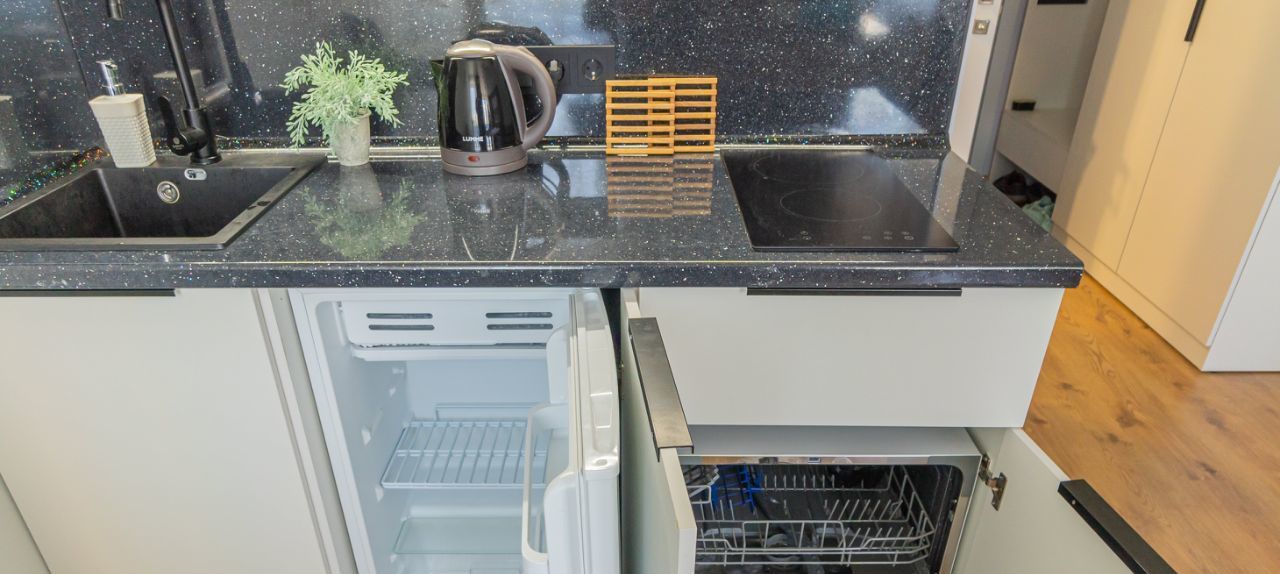 - обеденная зона (холодильник, чайник, микроволновка, плита, столовая группа, посуда на 2 персоны, стол со стульями, посудомойка)