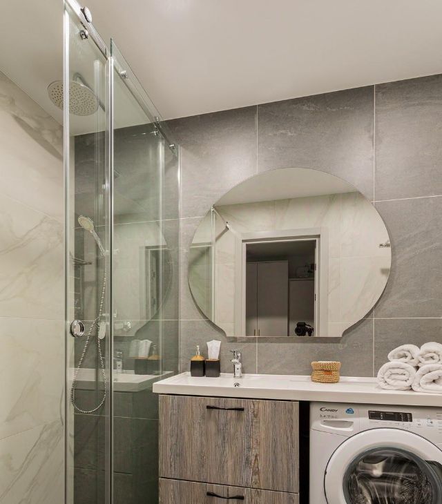 -Душ, стиральная машина, мыло, шампунь/гель для душа;