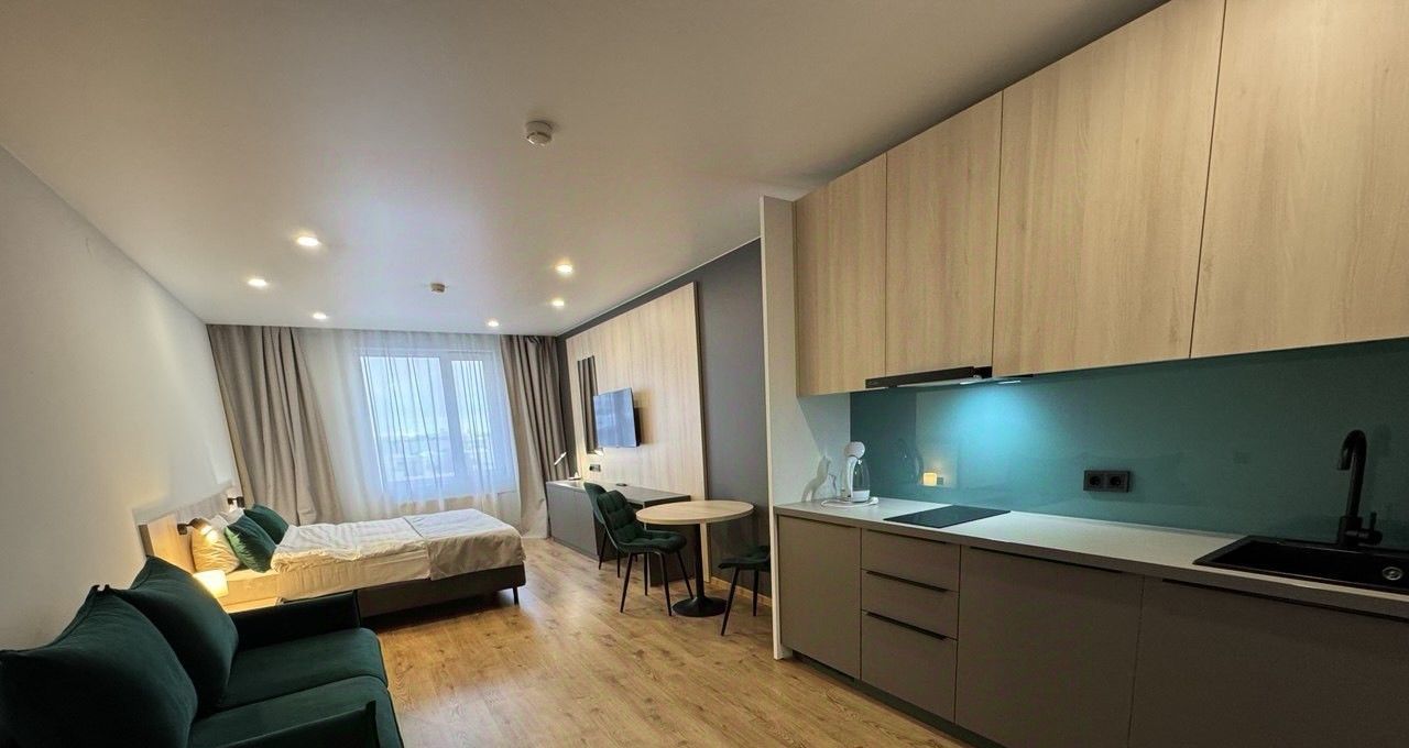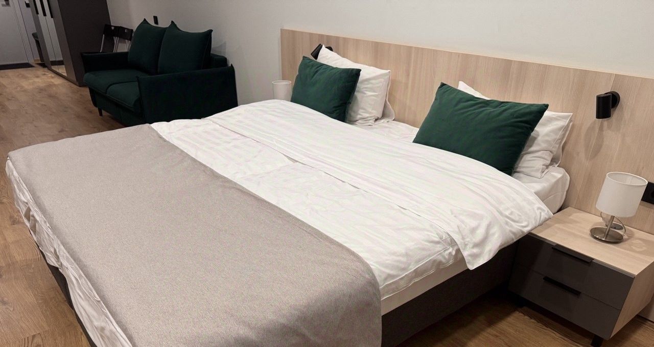 Сдается уютная студия в современном апарт отеле, расположенном по адресу: Киевская 5к6. Общая площадь апартаментов составляет 35 кв. м, из которых 30 кв. м — это жилая зона. Квартира находится на 8-м этаже девятиэтажного здания. В здании апарт отеля расположены: кофейня Цех 85, маркет Магнит, ресторан. Высота потолков — 2.6 метра, что создает ощущение простора и свободы. До станции метро "Московские ворота" всего 18 минут пешком.