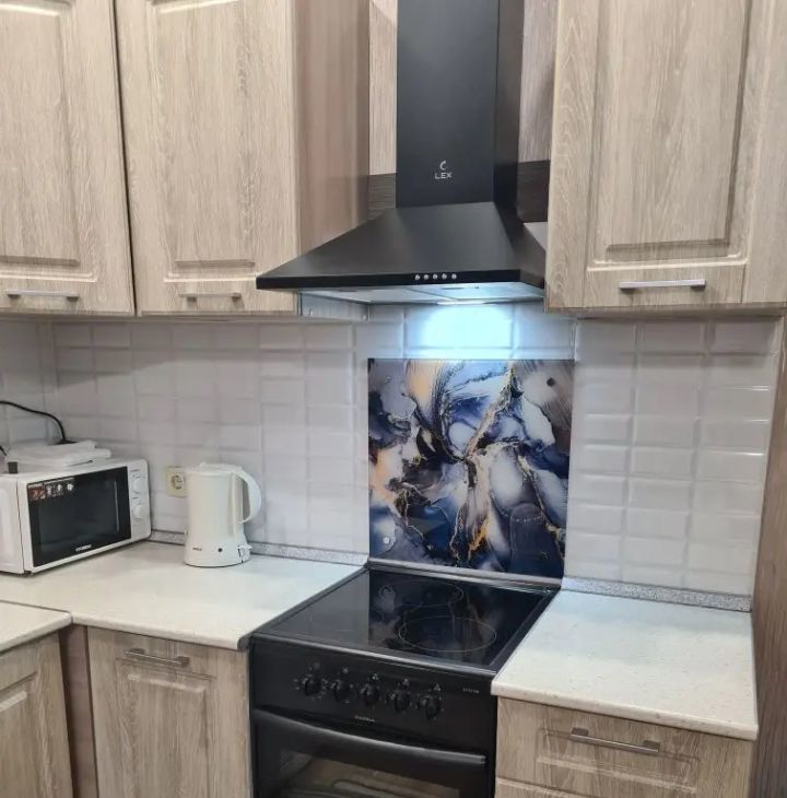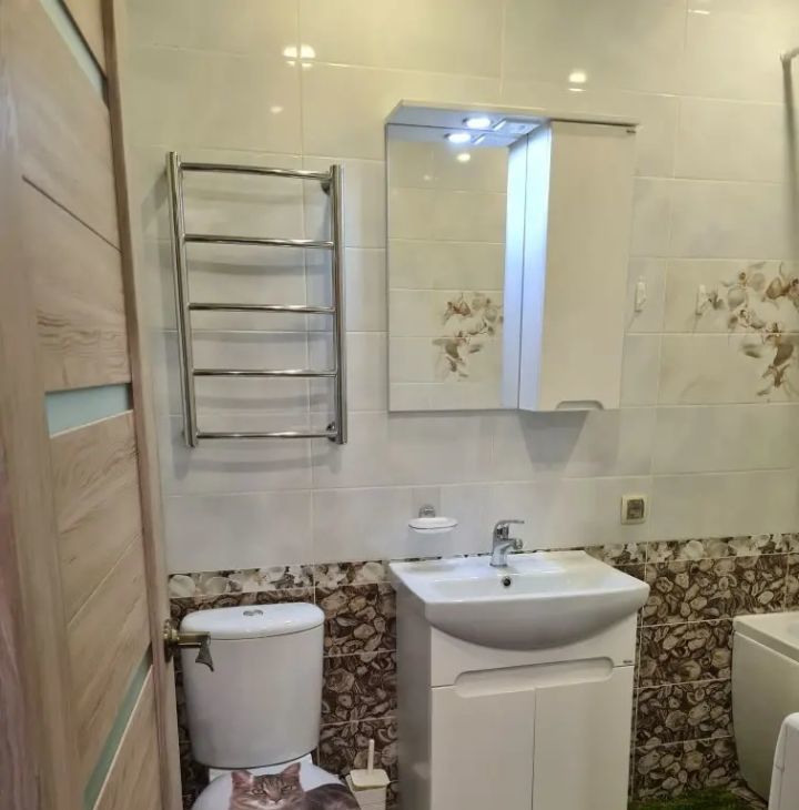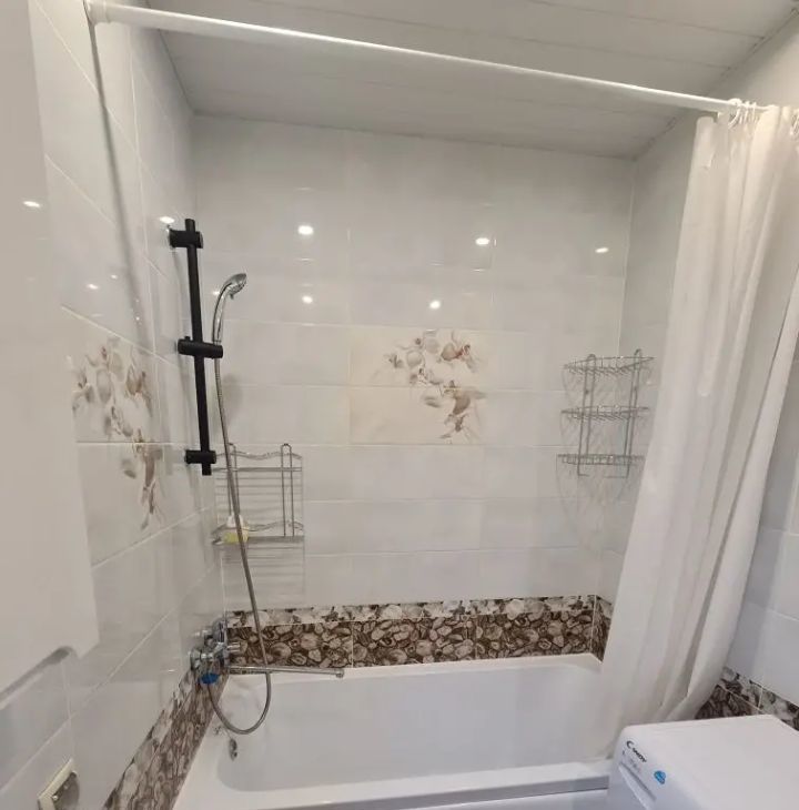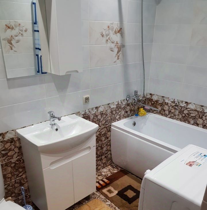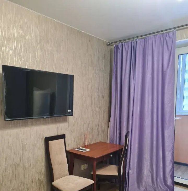 В квартире сделан дизайнерский ремонт. Пространство организовано с умом: жилая площадь составляет 18 кв. м, а кухня — 5 кв. м. В студии есть все необходимое для жизни: мебель как на кухне, так и в комнате. Ванная комната оборудована ванной, что добавляет комфорта. В квартире установлены кондиционер, холодильник, телевизор и стиральная машина, поэтому можно сразу заехать и жить.