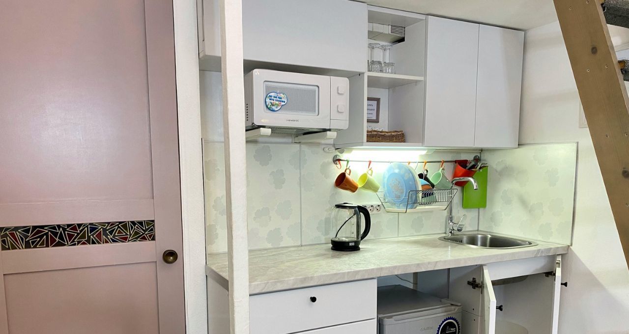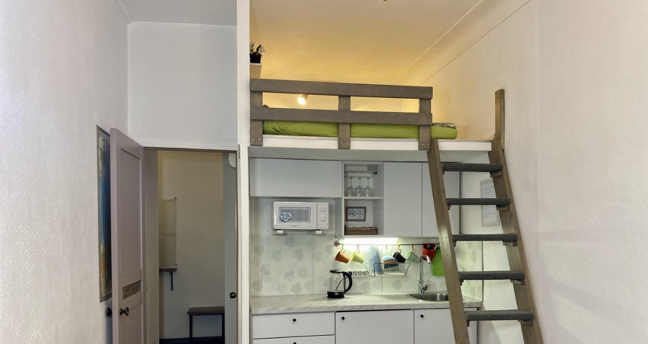 Студия расположена на первом этаже, окна выходят в тихий двор. В квартире тихо и спокойно, приятно работать, отдыхать и просто жить. Двуспальное место на втором уровне.