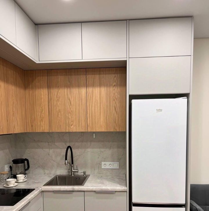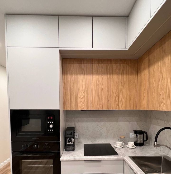 Кухня максимально функциональна и удобна, обеспечена также всей необходимой техникой и даже больше: в наличии помимо необходимого комплекта посуды, холодильника, посудомойки, духового шкафа, СВЧ печи, есть даже кофемашина!