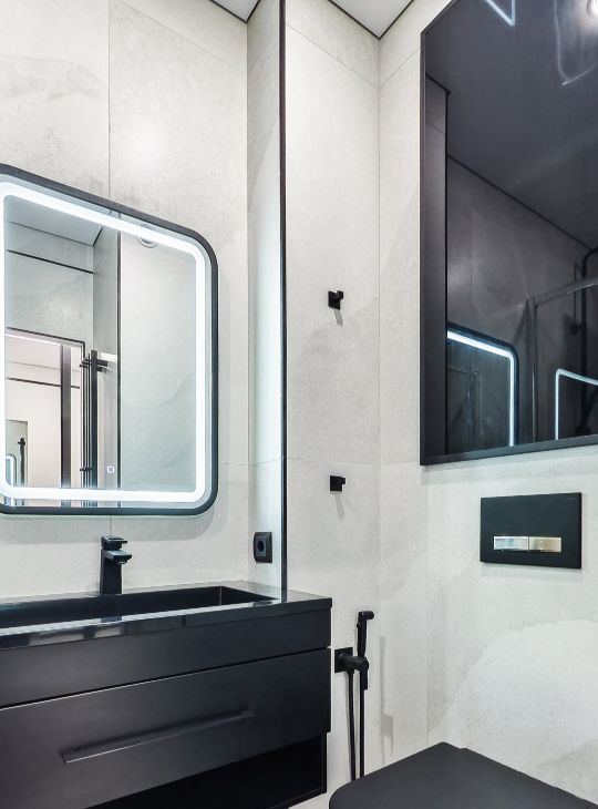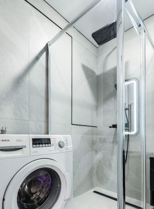 В ванной установлена душевая кабина, стиральная машина-автомат, тумба-раковина, зеркало с регулируемой подсветкой, туалет, водонагреватель, а также электрический полотенцесушитель.