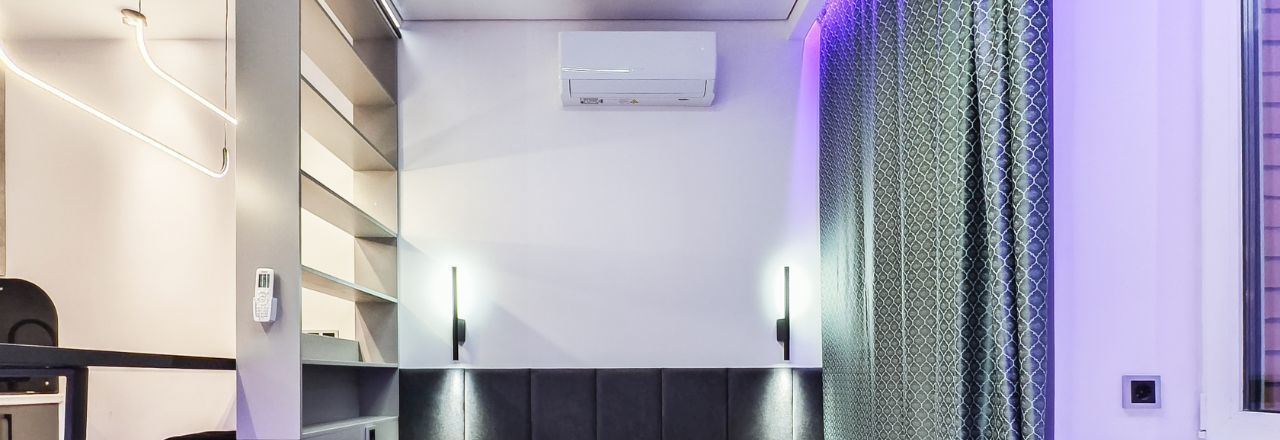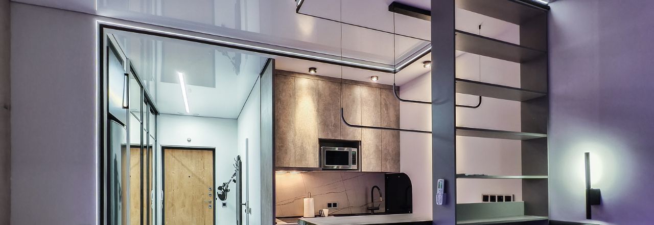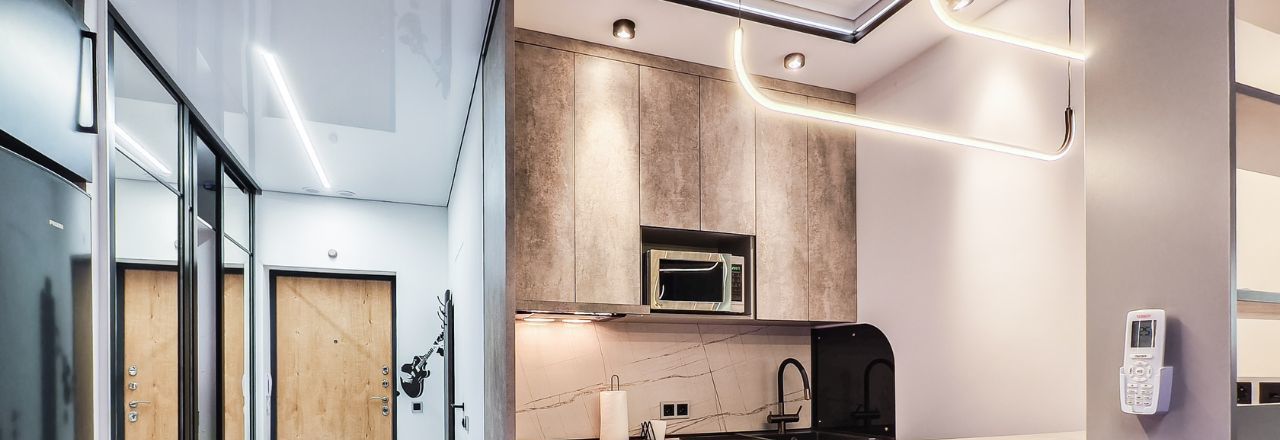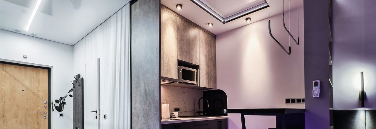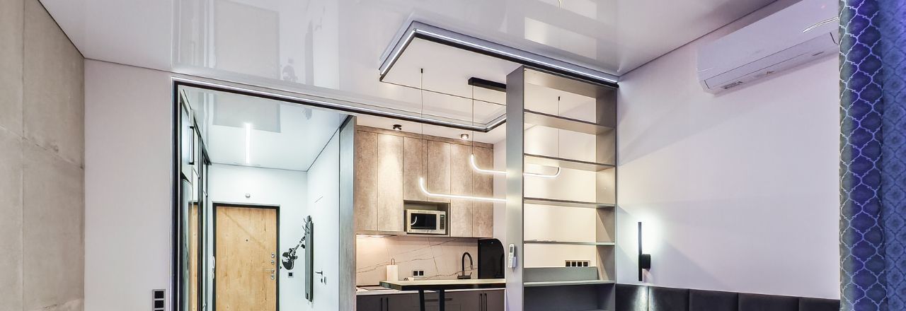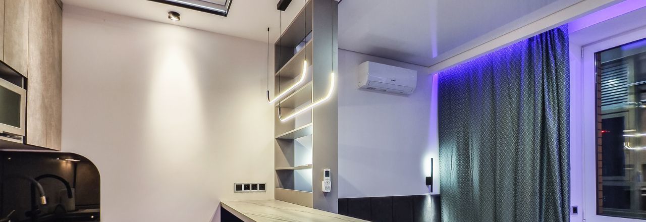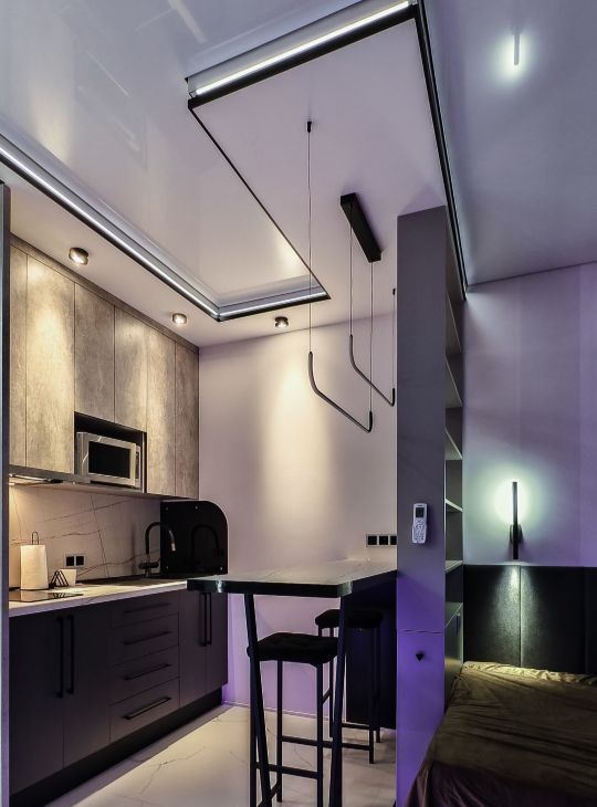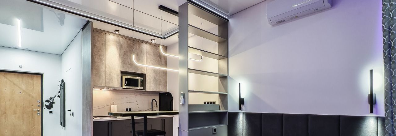 Ремонт и наполнение квартиры выполнены с нуля. Многозонный настраиваемый свет по всей квартире. Квартира визуально разделена на входную группу с вместительным зеркальным гардеробом и скрытой дверью в санузел, кухонную зону с барным столом, рабочей зоной со встроенным рабочим столом и рядом с полочкой-сидением, универсальным кронштейном для подключения телевизора, а также со спальной зоной-кроватью с прикроватными светильниками.