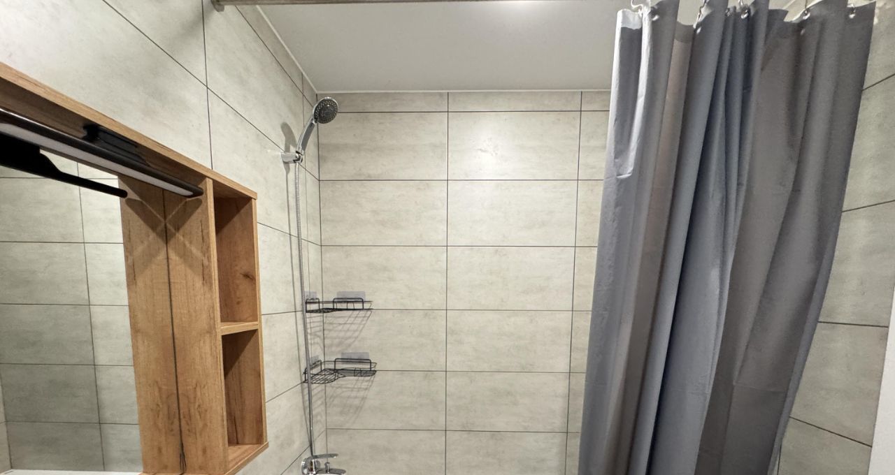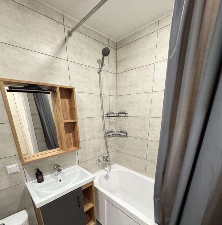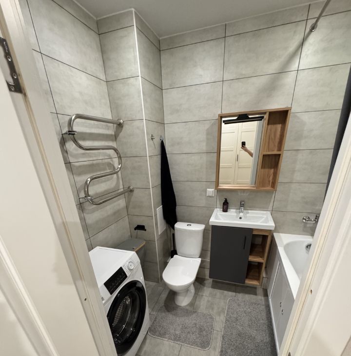Санузел совмещенный, оформлен современной плиткой, оснащен ванной и стиральной машиной. Туалет выглядит минималистично. Весь функционал есть.