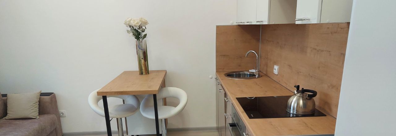 Сдаеться квартира студия от собственика на длительный срок (от года). Расположена в новом микрорайоне. В квартире сделан качественный ремонт. Полноценная кухня с элетрической панелью на 4 комфорки,вытяжкой, полноценым духовым шкафом, посудомоечной машиной и двухкамерным холодильником ноуфрост. Имеется диван со спальным местом 160см. Зальная стенка и большой телевизор диогональю 140 со смарт тв. Подключен интернет и телевидение. Установлен роутер. В сан.узле имеется новая стиральная машинка на 7 кг с функцией пара, пол с электрическим подогревоми, электрический полотенцесушитель. В коридоре встроеный шкаф купе с удобной системой хранения. В квартире имеется все необходимое для комфортного проживания 1 - 2 гостей. Рядом остановка общественного транспорта. До метро 15 минут езды на автобусе. Недалеко выезд на кад. В шаговой доступности много магазинов и кафе. Школы и детские сады во дворе. Оплата комунальных платежей, интернета и телевидения за счет квартиросъемщика + залог в размере арендной платы ( можно разбить на 2 платежа). Арендная плата 28000 т.р. (Видео квартиры по запросу).