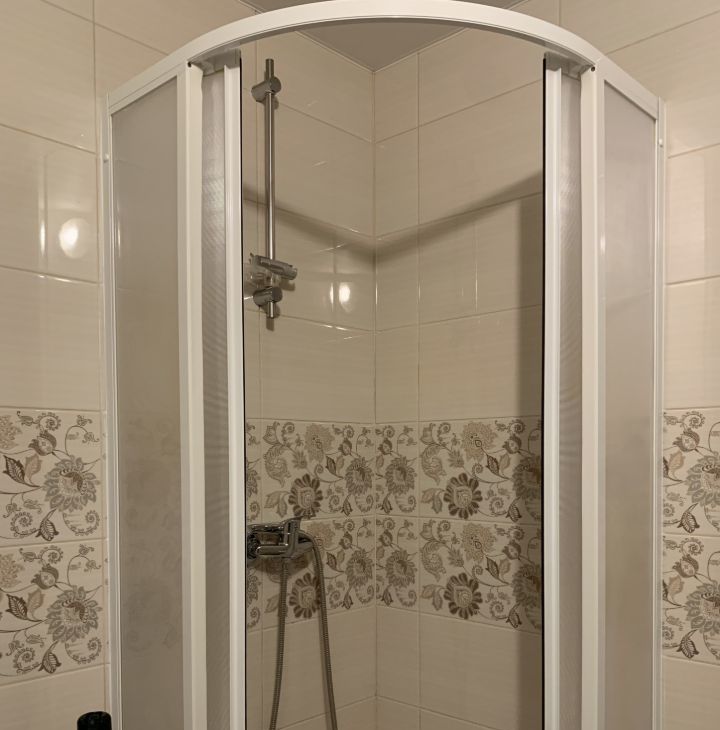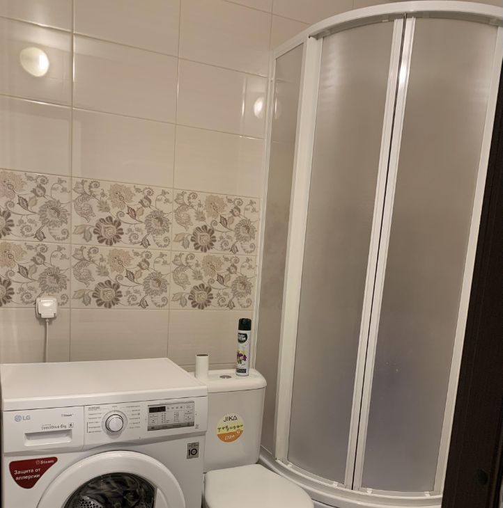Ванная комната совмещенная, оснащена душевой кабиной и стиральной машиной.