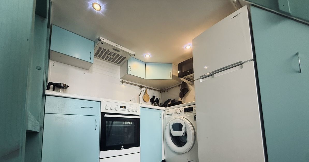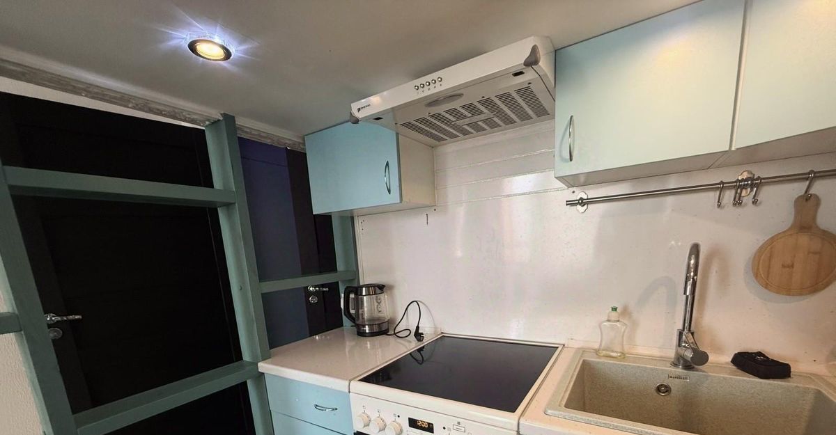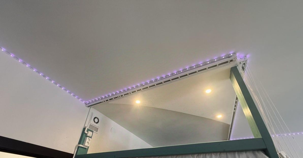 Квартира двухуровневая: основное спальное место находится на втором уровне. Там предусмотрены отдельное освещение, розетки и вытяжка для комфортного отдыха.