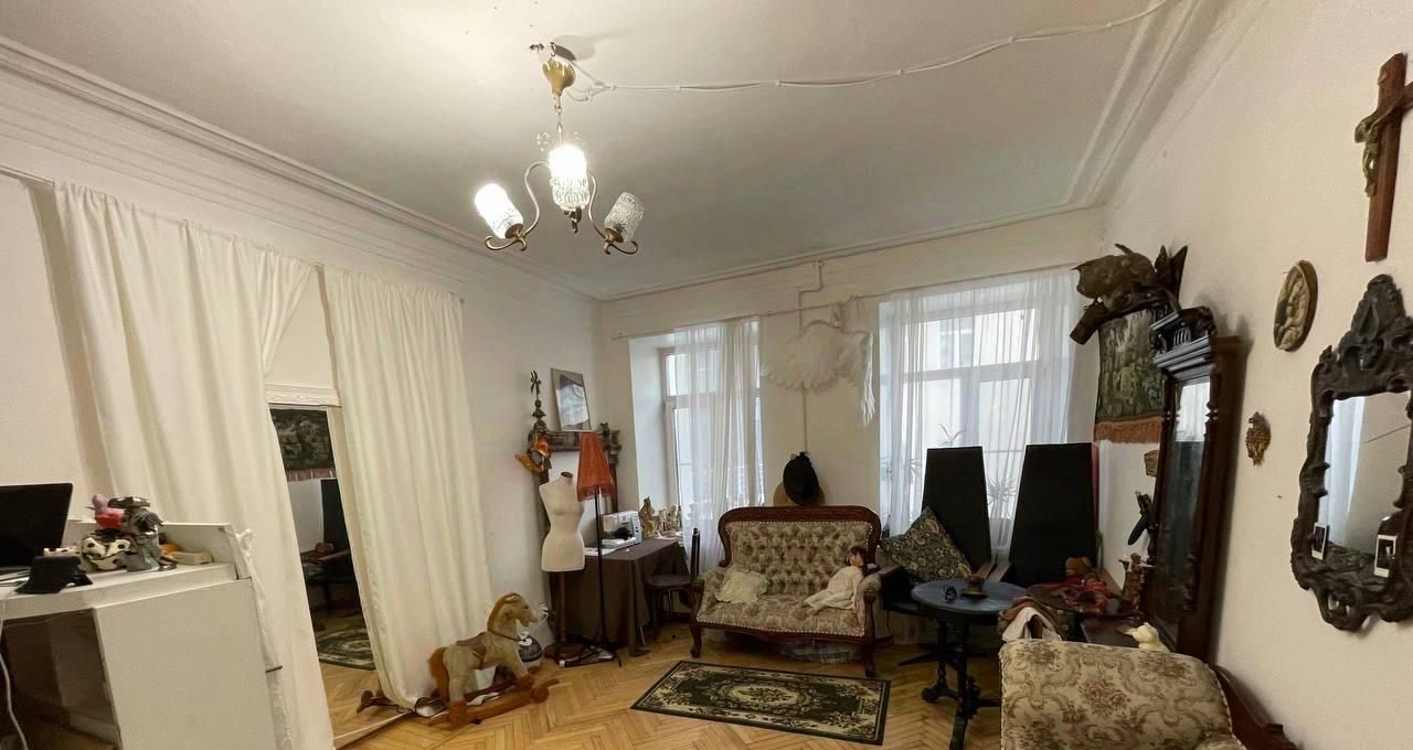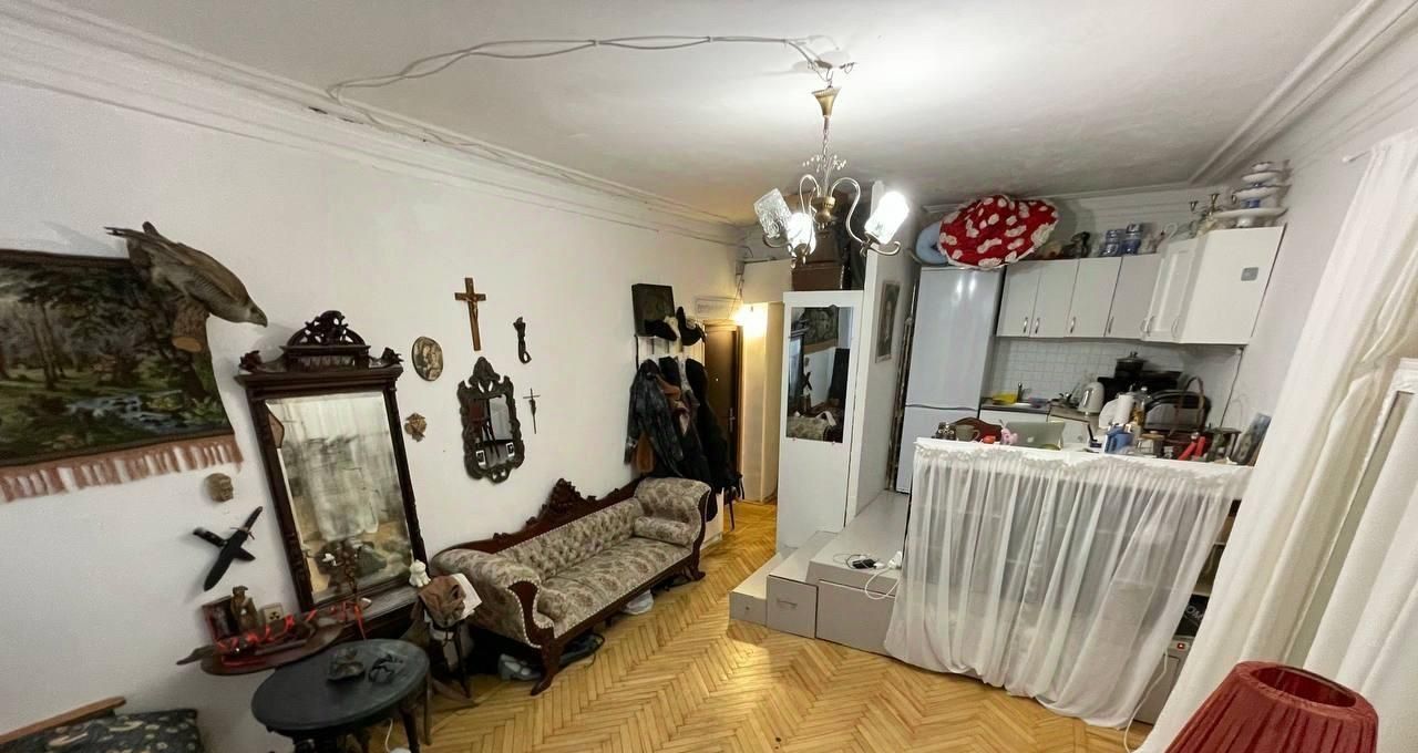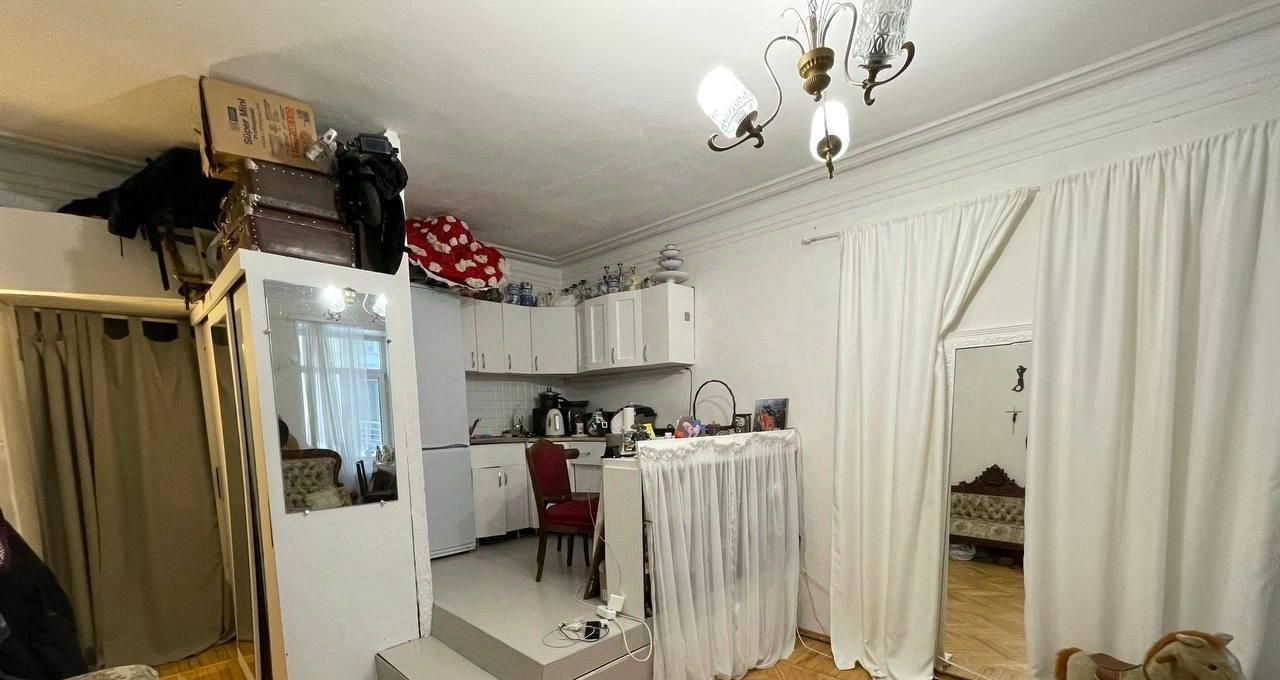 Комната, переделанная в студию. Своя кухня, туалет и душевая кабинка. Комната тридцать метров площадью, за ней отдельный санузел + 4,2 квадратных метра. ТАКИМ ОБРАЗОМ, ОБЩАЯ ПЛОЩАДЬ СТУДИИ ПОЛУЧАЕТСЯ 34,2 МЕТРА. Стиральная машина стоит на общей кухне, есть возможность переместить в комнату. Высокие потолки. Два больших окна. Выдвижная двуспальная кровать и встроенные длинные ящики в подиуме. Установлен отдельный счётчик электроэнергии.